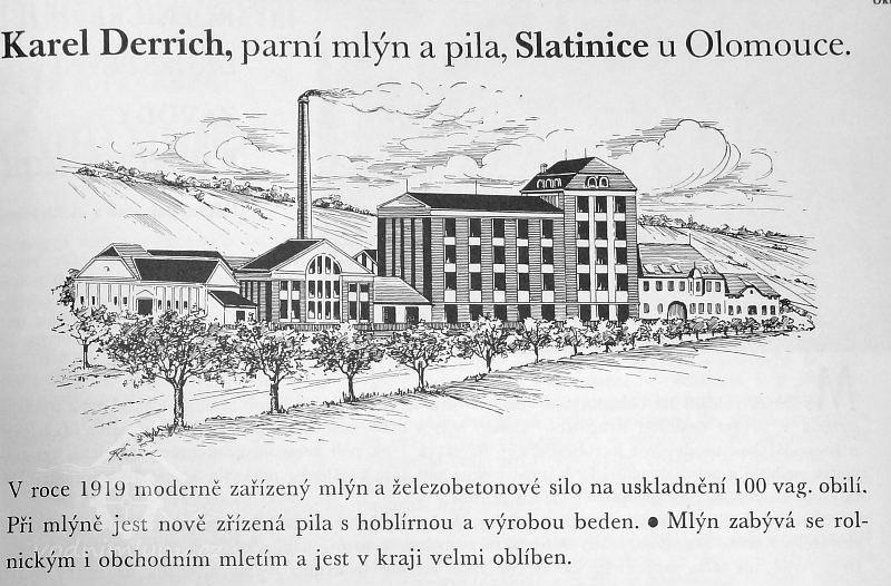 Augustin Malíšek (†1926) vedl původně se Slatinicích podnik pro výmalbu kostelů. Roku 1914 přestavěl statek čp. 14 na Hanáckou pražírnu žitné kávy, později známější pod obchodním názvem Hanačka 49°33'52.31"N, 17°05'52.59"E. Sestává z provozních budov ve dvoře a výstavné budovy administrativní a skladovací do ulice, která se dochovala v původní podobě, s nástavbou patra, provedenou po požáru v roce 1937. Armádní zakázky potravin umožnily Malíškovi hned po válce investovat do dalšího průmyslového podniku. Automatický parní mlýn, označovaný jako největší na střední Moravě, vyprojektovala a zařídila pardubická strojírna Josefa Prokopa synové. Architektonické řešení nese znaky typické pro stavby této firmy po první světové válce (mansardové střechy, režné fasádní zdivo), jeho autor však zatím není znám. Celek sestává ze samostatně stojící haly energocentrály, čtyřpodlažní mlýnice a nejvyšší části s obilními sily. Pro převzetí Malíškových podniků byla roku 1922 za účasti Moravsko­ ­slovenské banky v Olomouci založena akciová společnost Klas, o deset let později koupil mlýn v dražbě Karel Derrich, mlynář a majitel parní pily v Prostějově. Zrušil pražírnu čekanky ve dvorní části areálu a provozoval zde parní pilu s hoblírnou beden. Podnik byl prodán družstevní společnosti Moragro, po válce přešel pod Slovácké mlýny, po znárodnění byl krátce zastaven, ale roku 1957 pro pardubický n. p. Mlýny a těstárny rekonstruován. Přestavbu prováděla opět Prokopka, po znárodnění pod názvem Továrna na mlýnské stroje, mlýn vybavila pneumatickou dopravou mouky, první v republice. Provoz mlýna ukončila soukromá společnost roku 1997, dnešní vlastník jej však v roce 1999 obnovil, znovu vystrojil moderním zařízením a pečlivě opravil jeho budovu.