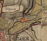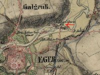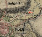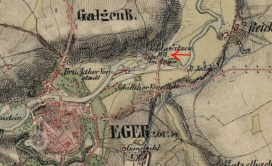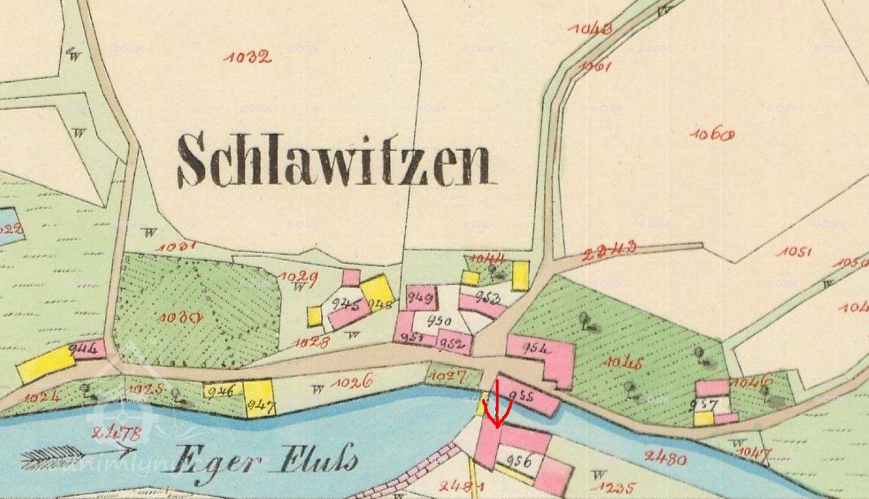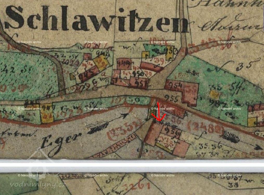 Značka mlýna je zakreslena na I. a II. vojenském mapování. Podle císařského otisku a indikační skici z roku 1841 se mlýn skládal z několika budov a byl z nespalného materiálu. Mlýn se třemi vodními koly byl poháněn vodou z náhonu z řeky Ohře a na protějším břehu náhonu stála pravděpodobně pila s jedním vodním kolem. Majitelem domu čp. 37 a pravděpodobně také mlynářem byl podle indikační skici Georg Kahler.