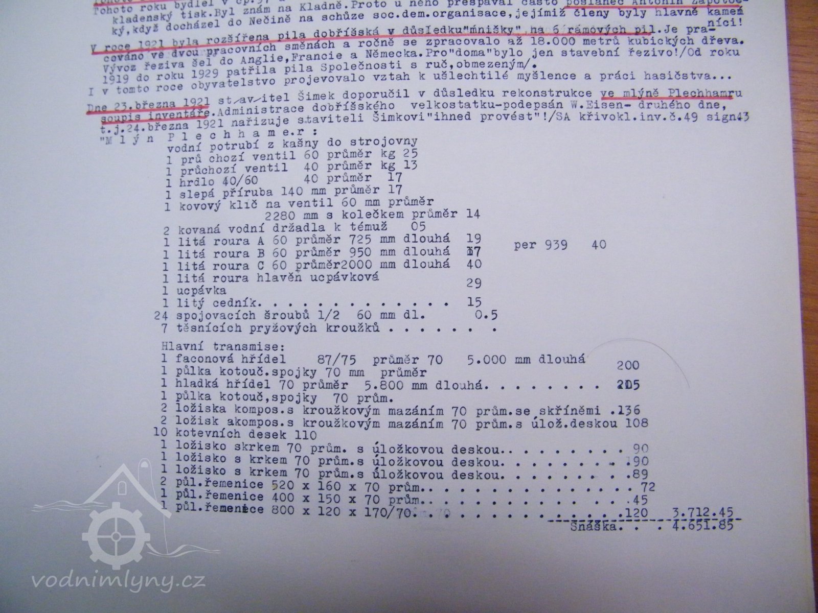 Dne 23. března 1921 stavitel Šimek doporučil v důsledku rekonstrukce v mlýně Plechhammeru soupis inventáře. Administrace dobříšského velkostatku - podepsán W. Eisen. Celkem seznam pokračuje dál výčtem všech úchytových šroubů, které měly být vyúčtovány u železáren v Dobříši, tedy ve Staré Huti, a to úhrnem za 6.006.95,- Kč.