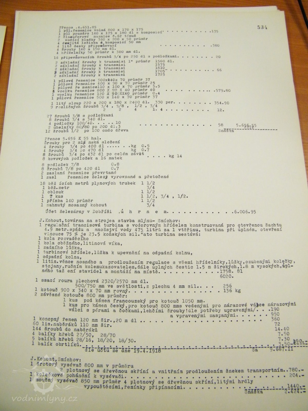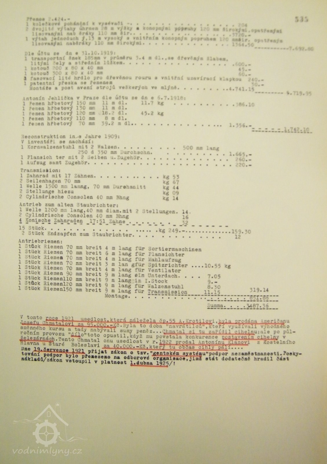 Po tomto seznamu následuje úplný výčet malých součástí, který podle účtu vypsaného dne 19.4. 1918 vyšel na 9.667.711 tehdejších rakouských korun. V soupise také navíc uvádí přepis jiného soupisu z r. 1909, kdy mělo dojít k rekonstrukci vybavení mlýna.