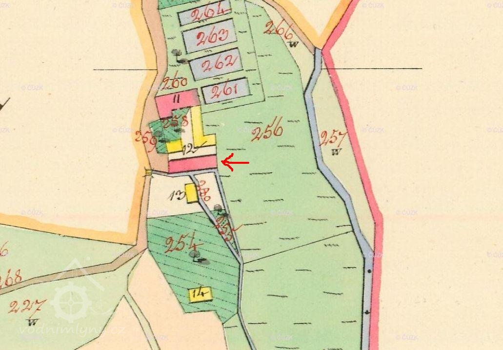 Popis1930: 3 kola na svrchní vodu, hltnost 0,377 m3/s, spád 9,6 m, výkon 14 HP