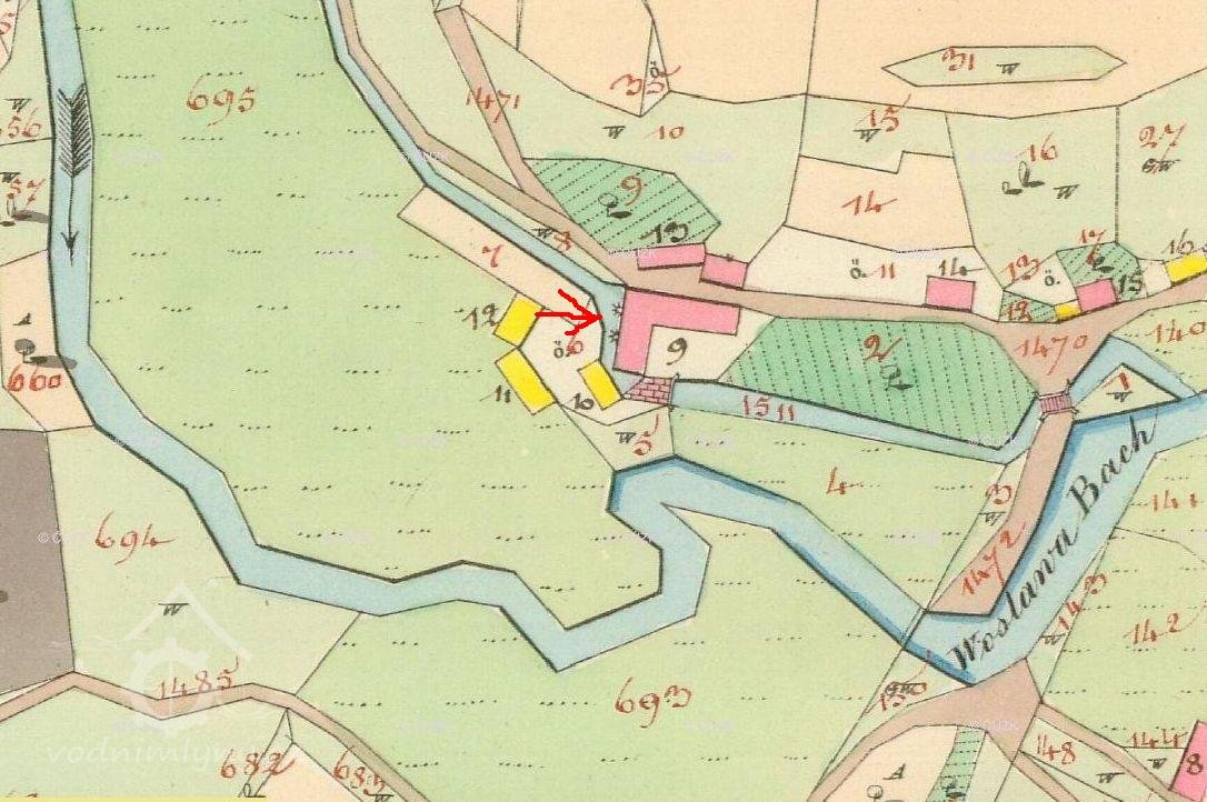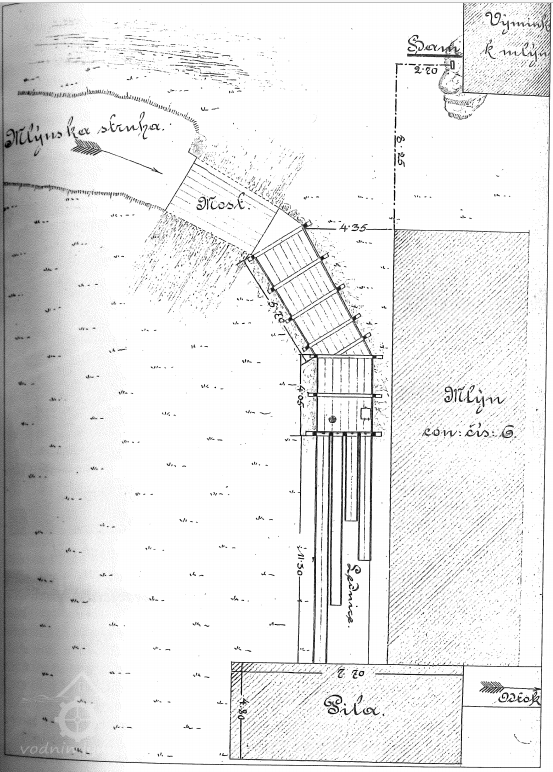 1930: 1 kolo na svrchní vodu, hltnost 0,37 m3/s, spád 4 m, výkon 13 HP, prům. 3,6 m, šíře 2 m