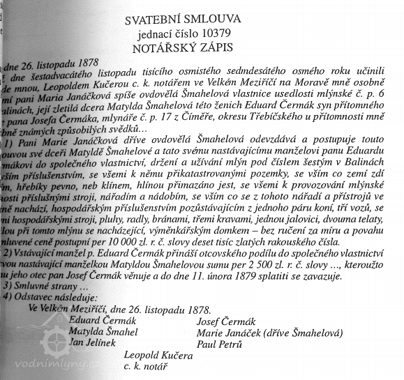 26.11.1878 Matyldu Šmahelovou, dceru Ferdinanda Šmahela a Marie roz. Webrové si vzal Eduard Čermák (*25.6.1854), syn Josefa Čermáka, mlynáře z Číměře