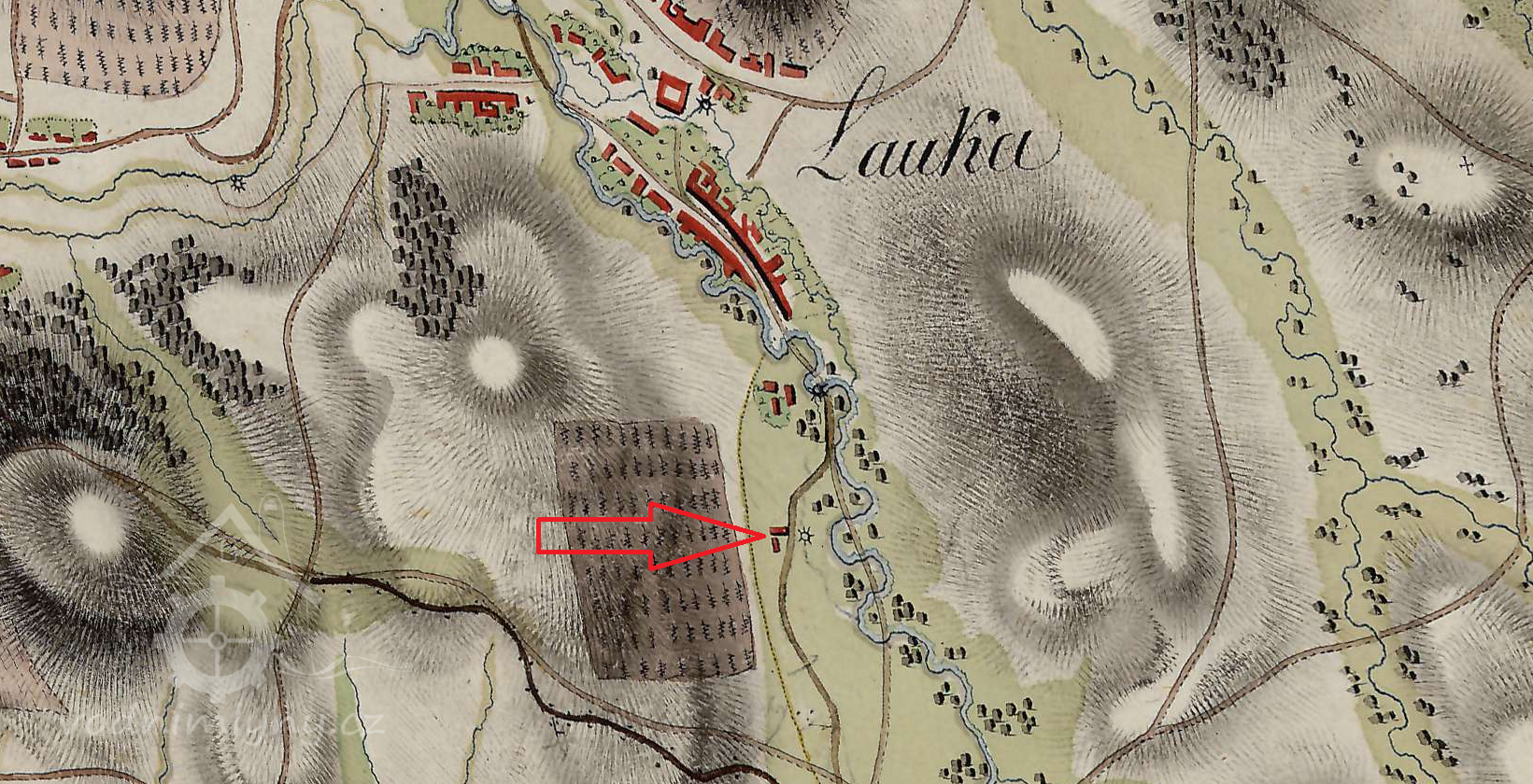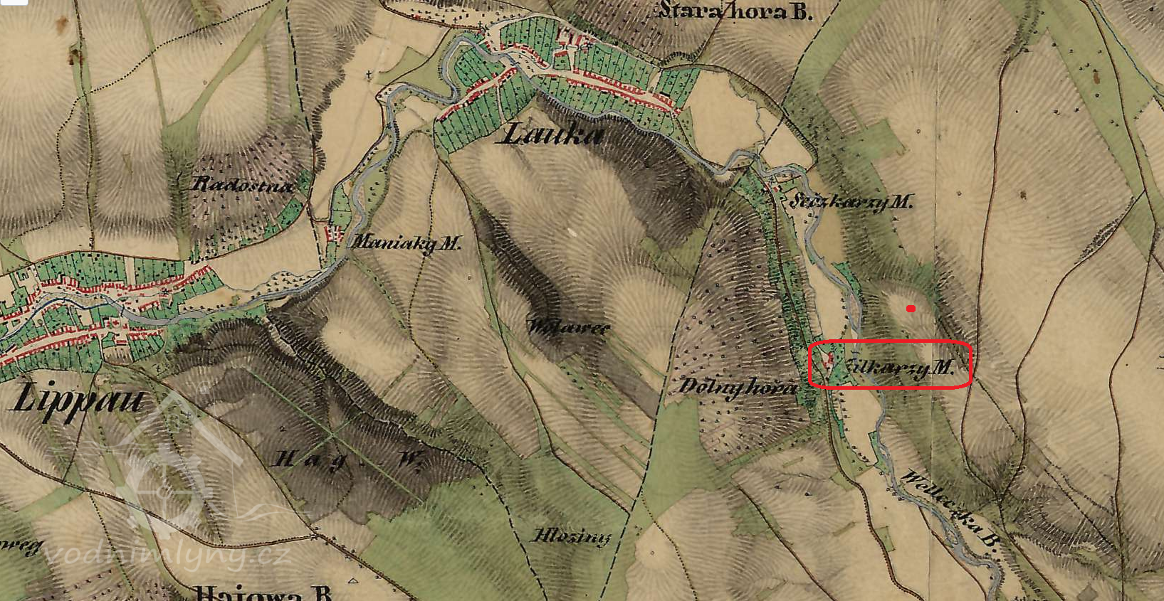 Velký mlýnský areál na samotě severně od Velké, původní situace se zde dramaticky změnila výstavbou silnice, železnice a regulací Veličky.