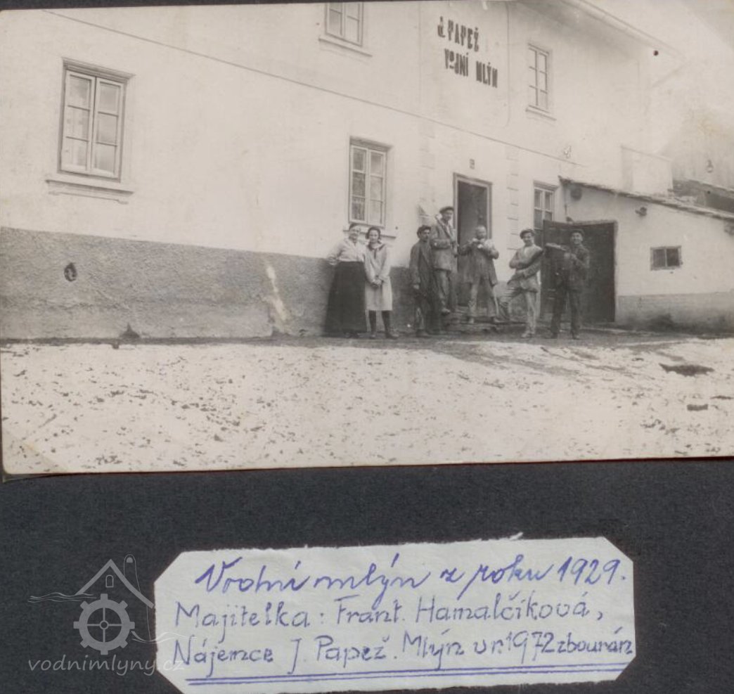 PopisPo odchodu Papeže vedl mlýn syn majitelky Josef Hamalčík (zemřel na TBC), po něm převzal nájem Leop. Hofman a pak Josef Koncer, jenž opatřil mlýn turbinou a rozšířil o jednu stolici. Po zavedení elektrického proudu v r. 1939 instalován i pohon elektrický.