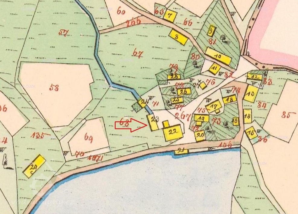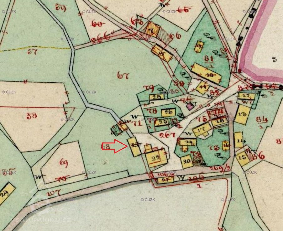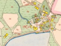 Na indikační skice z roku 1843 je mlýn zakreslen jako budova ze spalného matriálu pod hrází rybníka.