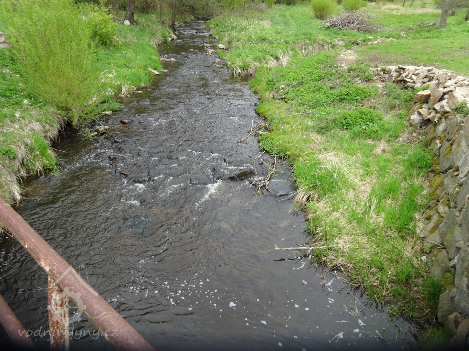 1927: Do mlýnské stoky, uzavíratelné stavidlem, vedena je voda Zlatého potoka vzdutá dřevěným jezem s kamennou výplní o délce v koruně 12,2 m. Na levém břehu náhonu, na rozhraní pozemků 309 a 312 ústí do náhonu odpadní stoka z mlýna v Lažišťce. Mlýnská stoka od jezu k vantrokům měří 630 m. Dřevěnými žlaby délky 6 m, světlé šířky 1,34 m a hloubky 0,5 vedena je voda do dvou dřevěných koryt uzavíratelných stavítky o rozměrech 55x33 cm a 30x30 cm. Jalové stavítko se nalézá na levém břehu náhonu a má šířku 75 cm. Odpadní strouha ústí 52 m od mlýna do Zlatého potoka