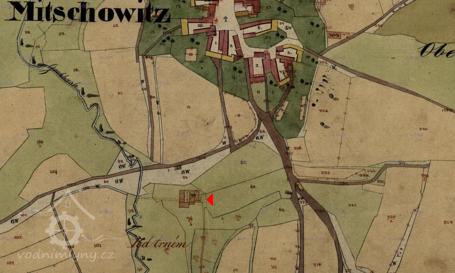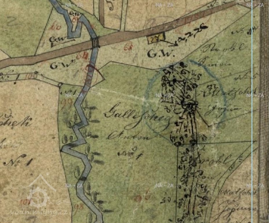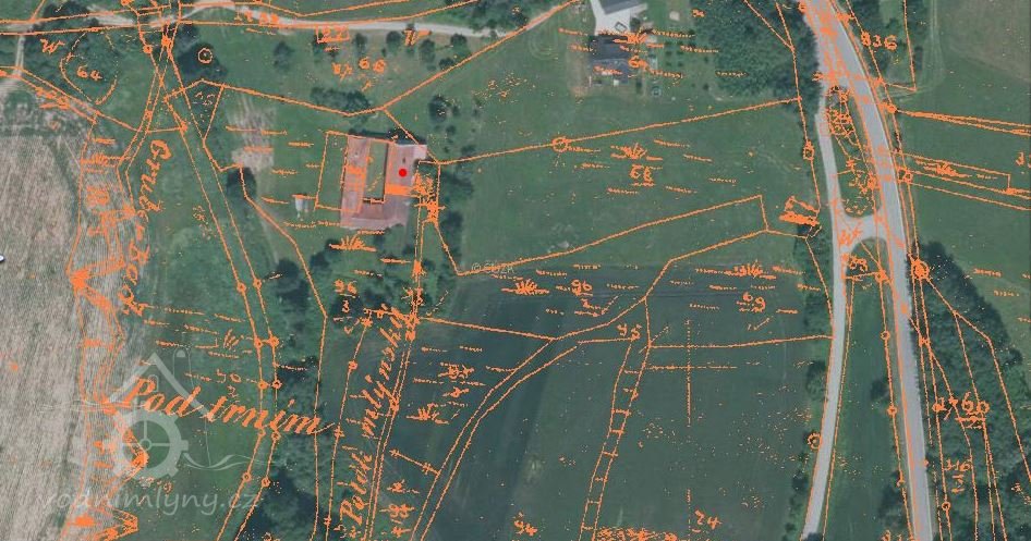 Voda Jánského potoka je při hranici parcel č.k.198/1, 196 a 171 do náhonu na pravém břehu ústícího bez jakéhokoliv vzdouvacího zařízení. Náhon před mlýnem vedený po svahu je rozšířen v nádrž o ploše ca 120 m2 a průměrné hloubce 0,5 m, takže kubický obsah nádrže je 60 m3. Voda z nádrže je vedena vantrokami 60 cm šíře a 70 cm výše k vodnímu stavítku 26x26 cm velikému a od toho žlabem na vodní kolo na svrchní vodu o průměru 4,8 m, světlé šířce mezi věnci 0,58 m a radiální hloubce 0,23 m.