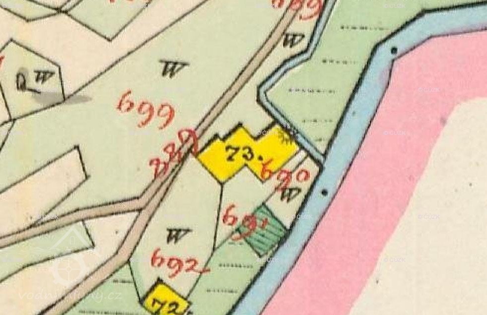 1930: 1 kolo na svrchní vodu, hltnost 1,7 m3/s, spád 4,8 m, výkon 4,78 HP