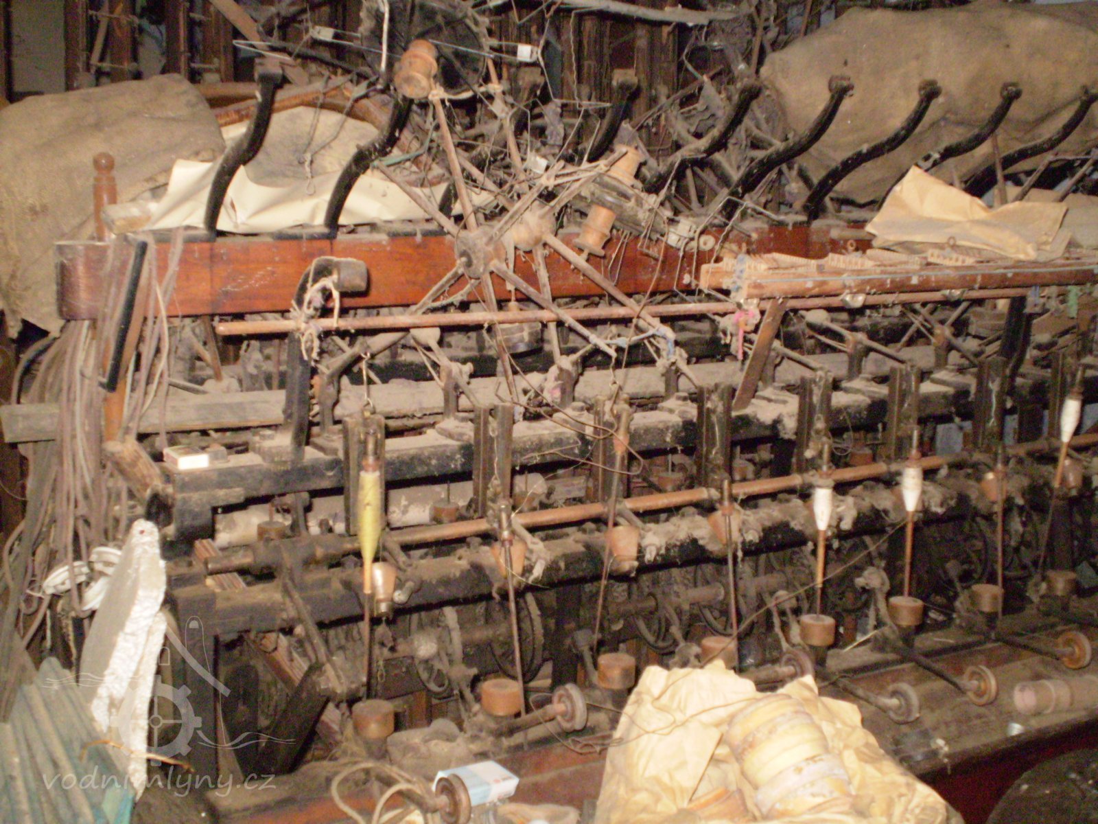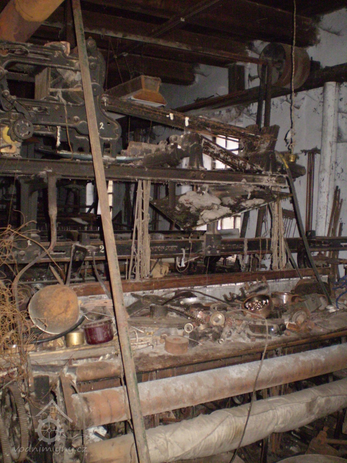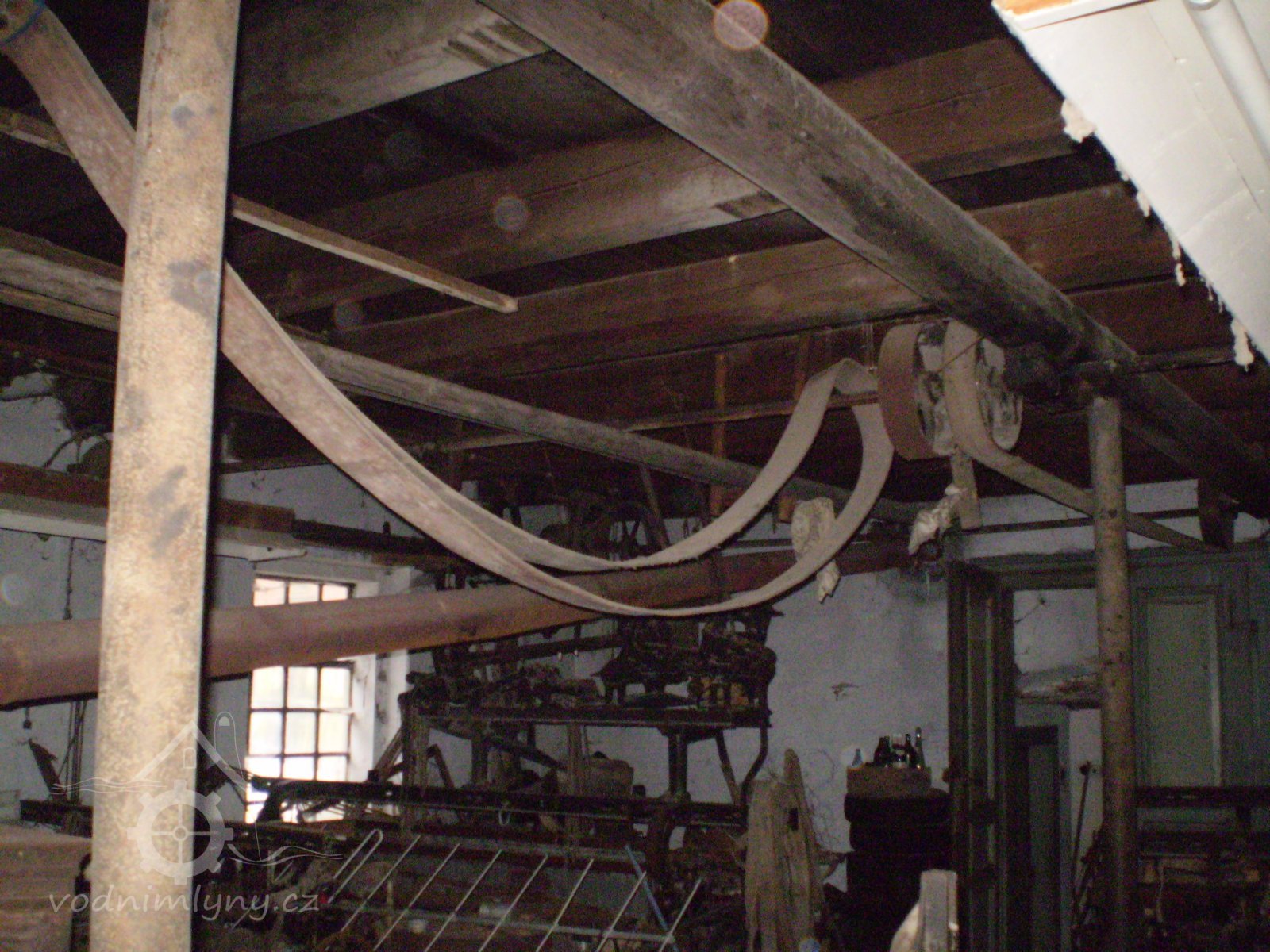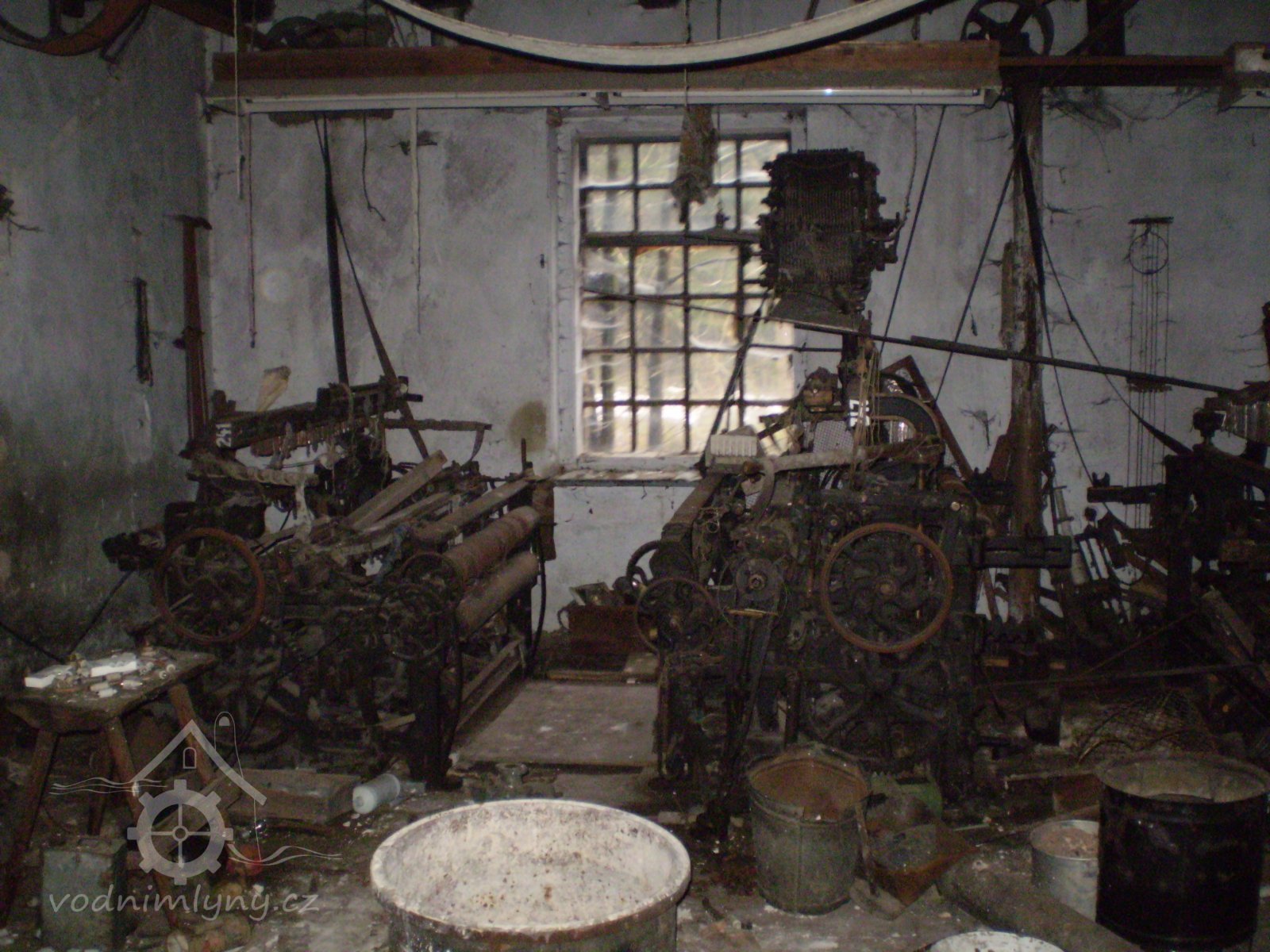 TKALCOVNA >> V tkalcovně bylo do r. 2007 14 mechanických stavů, z toho 11 hladkých, jeden revolverový a dvě listovky. Stroje byly v přízemí a byly poháněny původním dřevěným palečním kolem napojeného od hřídele vodního kola. Na palečním kole je napojen dřevěný cévník na kovové hřídeli a velká dřevěná a litinová řemenice. Dřevěná řemenice poháněla ještě přes předlohovou transmisi se setrvačníkem samostatně dynamo, litinová pak několik transmisí. Transmise poháněla v rozsáhlém prostoru přízemí tkalcovské stavy a v prvním patře soukačku, snovačku a převíječku. Dále transmise poháněla mlýnské stroje v přístavku, kovoobráběcí soustruh a frézku. Byl zde i pomocný stabilní motor a diesel-generátor. Regulaci konstantních otáček zajištoval mechanicky Wattův kulový regulátor napojený na třecí brzdu, který v případě nárůstu otáček transmisi brzdil.