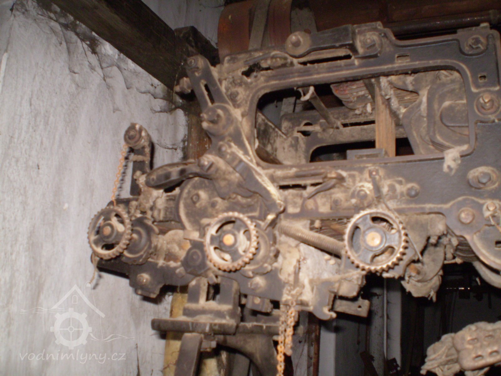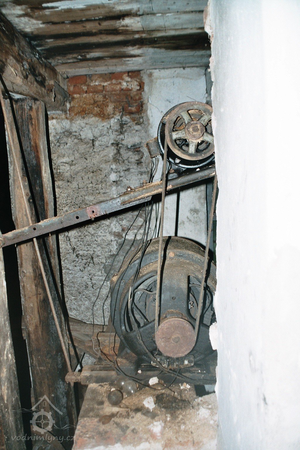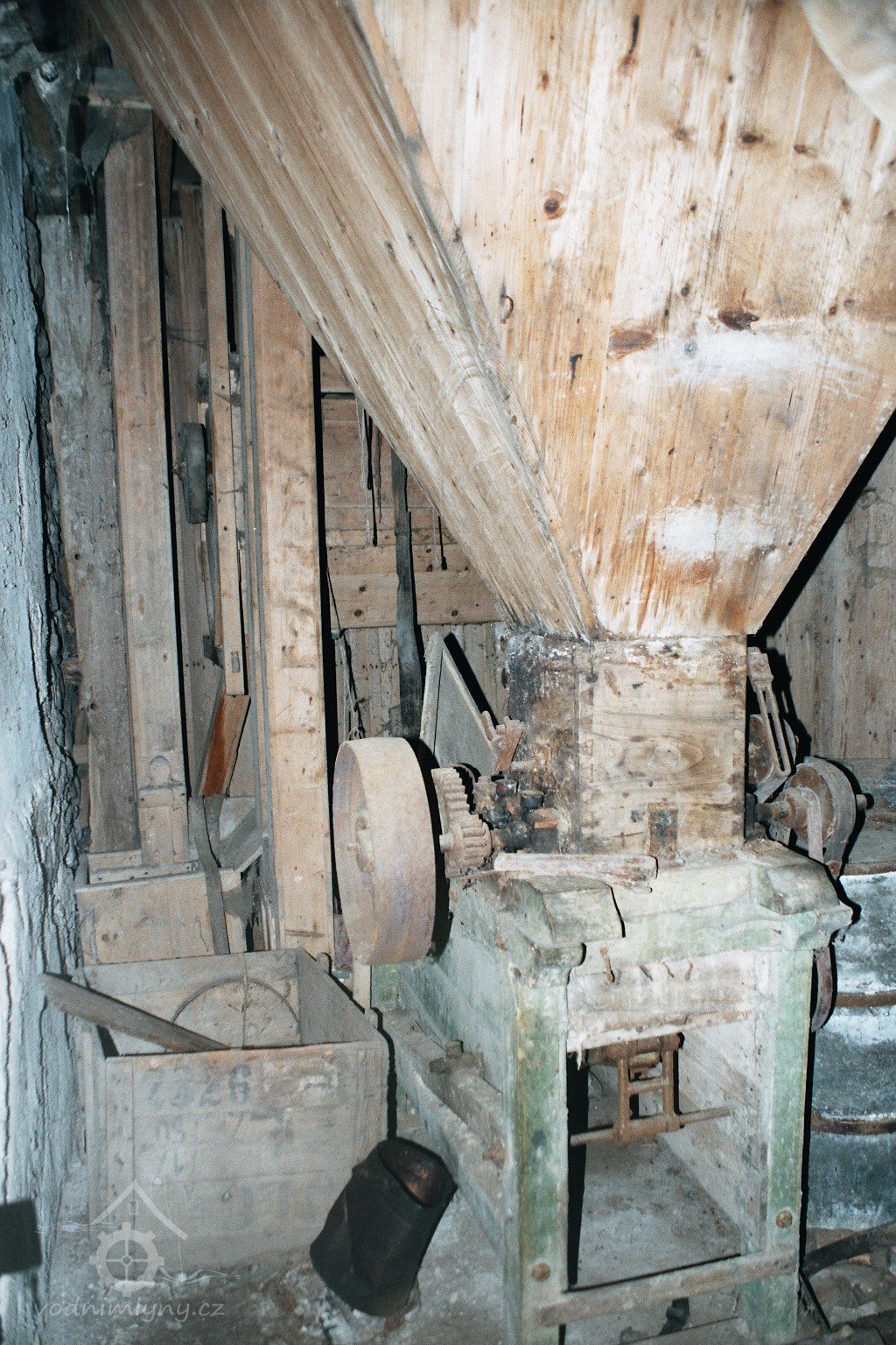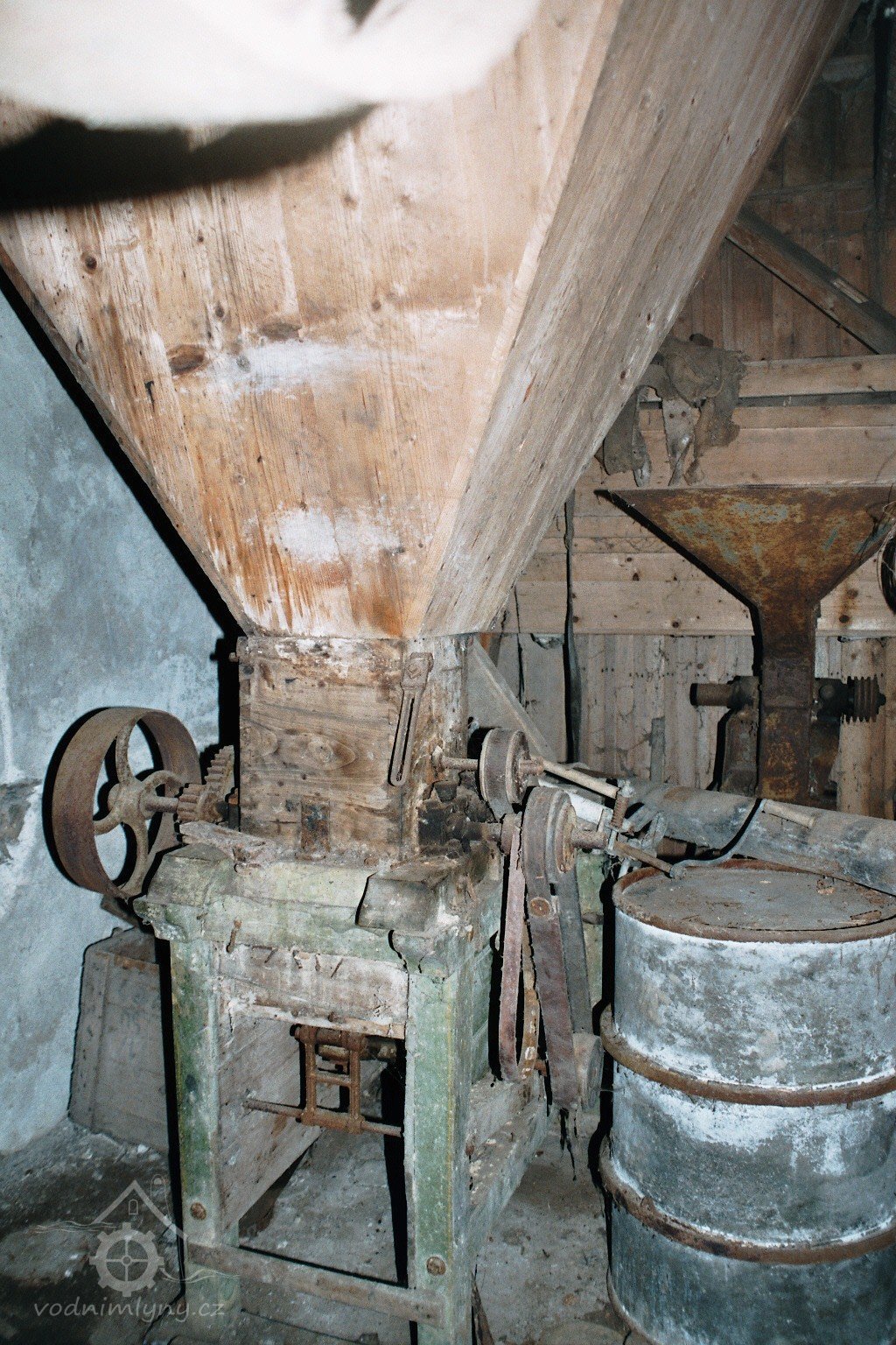 MLÝN >> Mlelo se na jednoduché mlecí stolici domácí výroby. Pod stolicí je excentrické žejbro, dále jsou zde 2 jednoduché kapsové dopravníky, malý moučný hranolový vysévač, novější šrotovník a násypný koš. Stroje byly poháněny jednou menší transmisí.