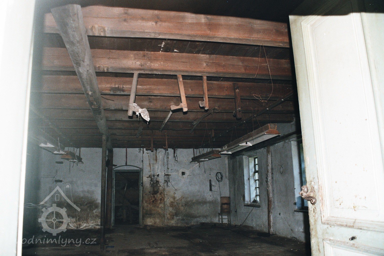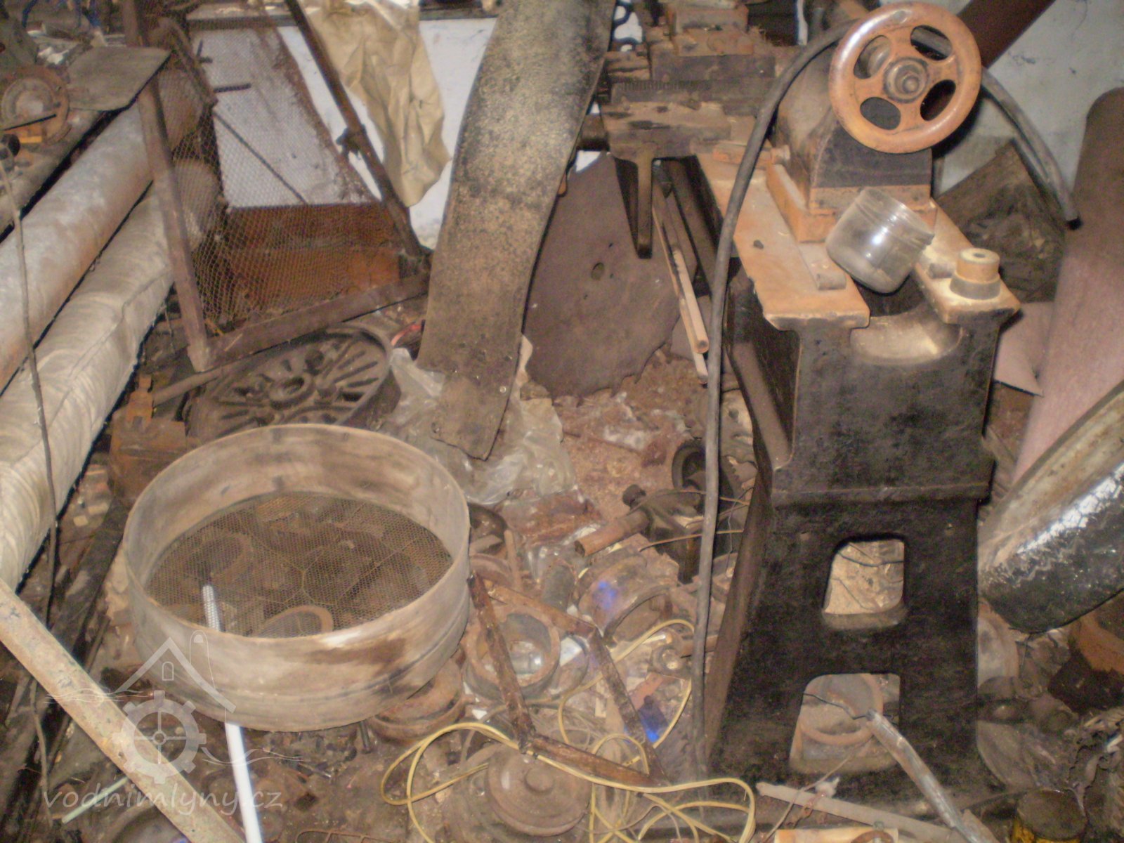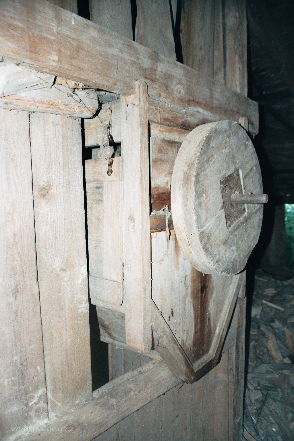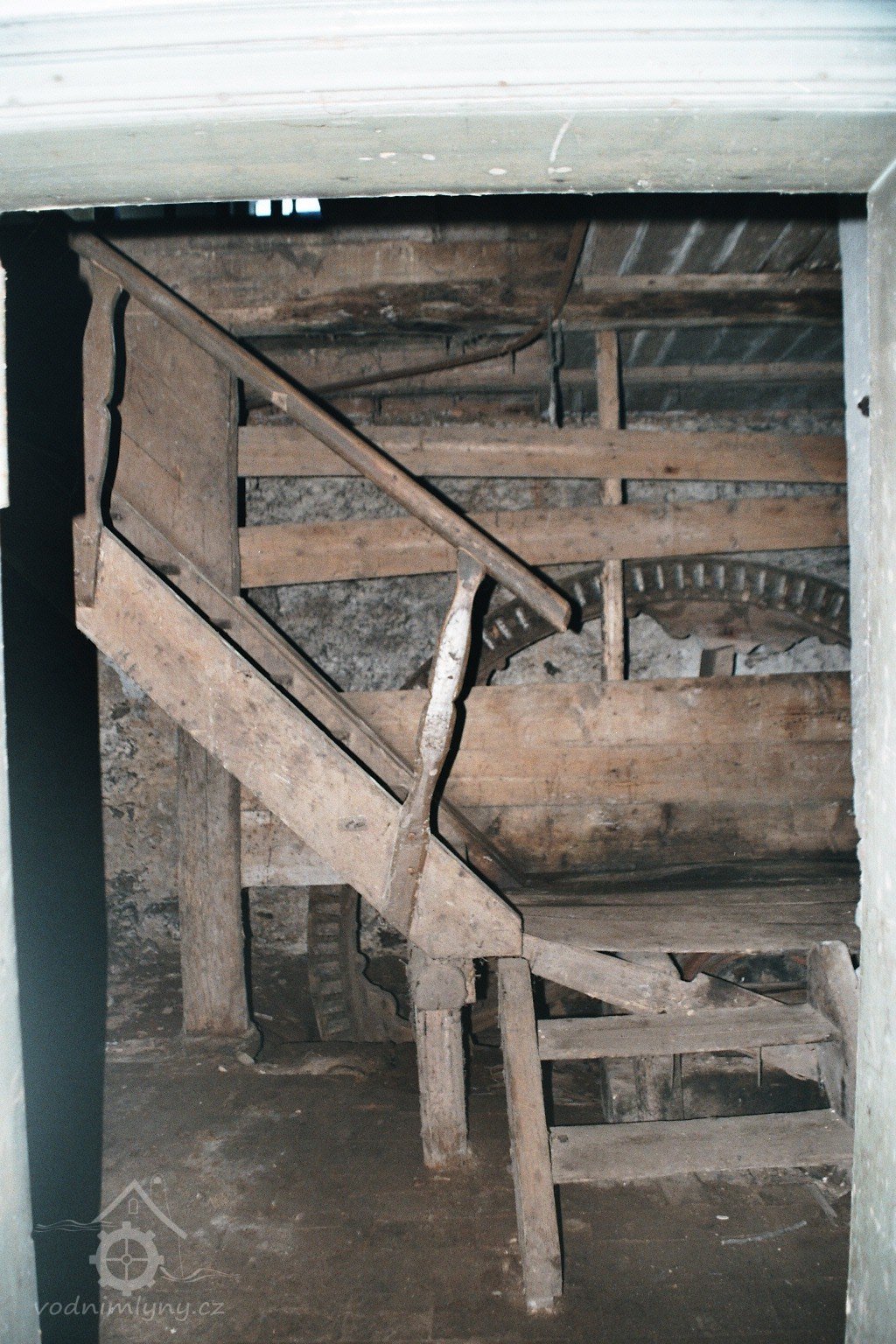 MLÝN >> Mlelo se na jednoduché mlecí stolici domácí výroby. Pod stolicí je excentrické žejbro, dále jsou zde 2 jednoduché kapsové dopravníky, malý moučný hranolový vysévač, novější šrotovník a násypný koš. Stroje byly poháněny jednou menší transmisí.