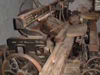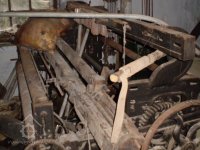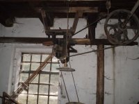 Zemědělské stroje poháněny dřevěnou řemenicí od transmise mlýna.