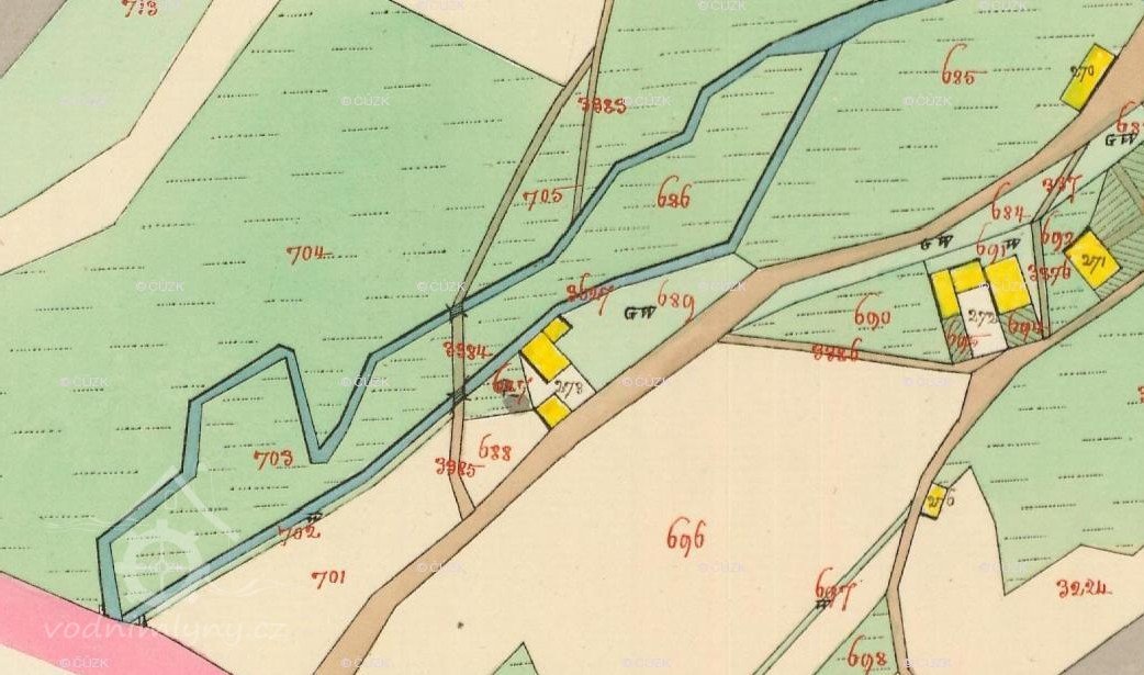 V r. 1930 zde bylo 1 kolo na svrchní vodu, průtok 0,185 m3/s, spád 3,05 m, celk. výkon 8,14 k.