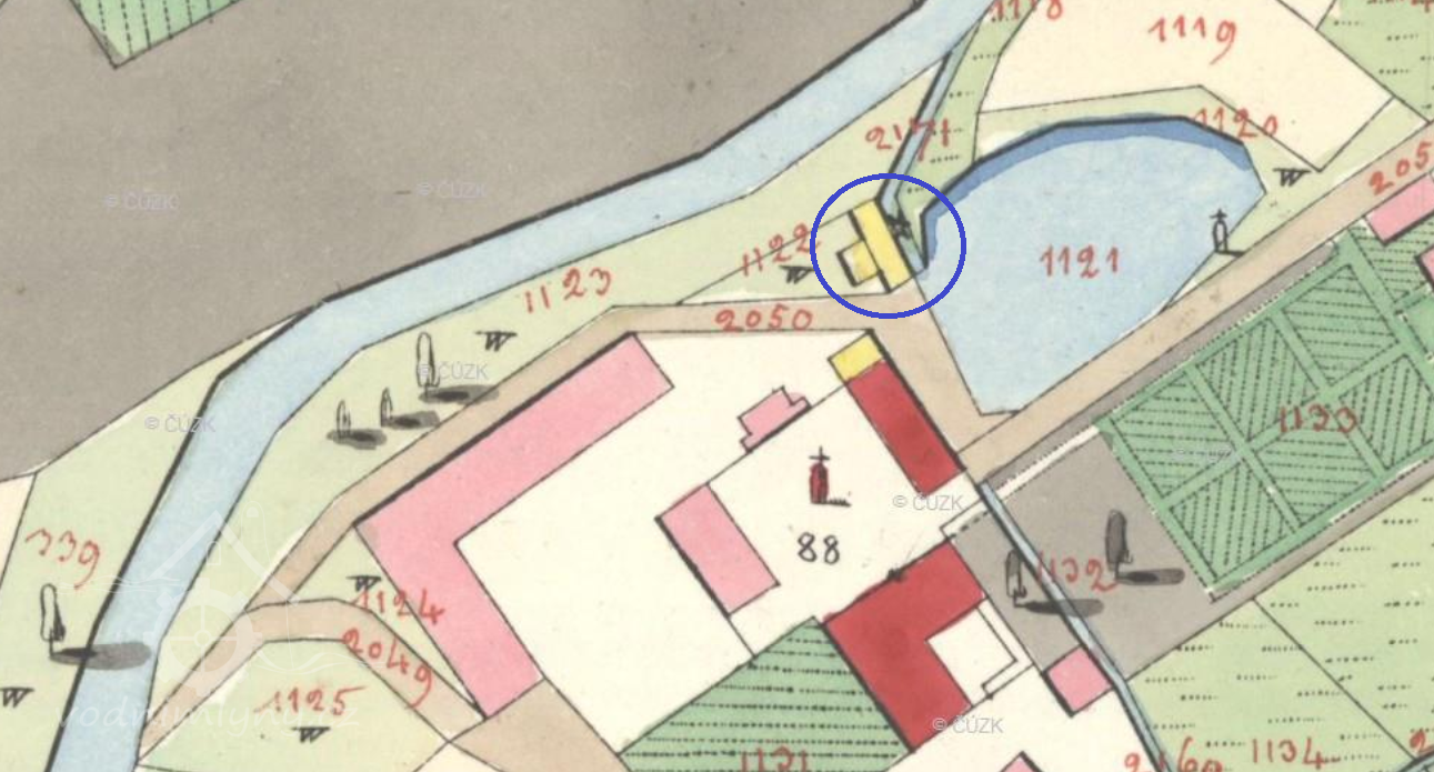 Popis1930: 1 kolo na svrchní vodu, hltnost 0,262 m3/s, spád 2,45 m, výkon 5,5 HP (4,07 kW)