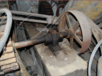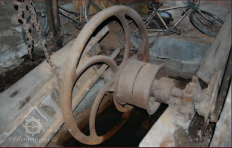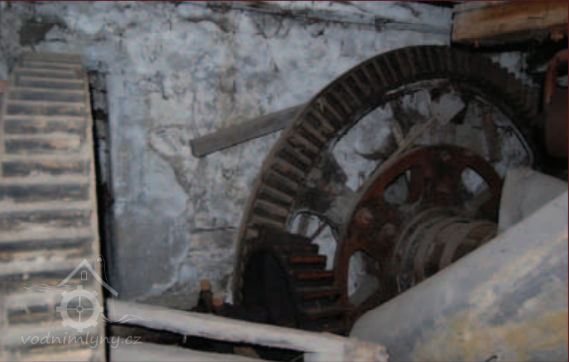 Technologické zařízení v suterénu mlýna, 2013, © Vodní mlýny na Frýdecko-Místecku, (Prvky na obrázku: transmise, řemenice, převody - ozubená kola, pastorky (průmyslový výrobek), transmise, řemenice, převody - transmisní hřídele s řemenicemi (výrobek průmyslový i řemeslný))