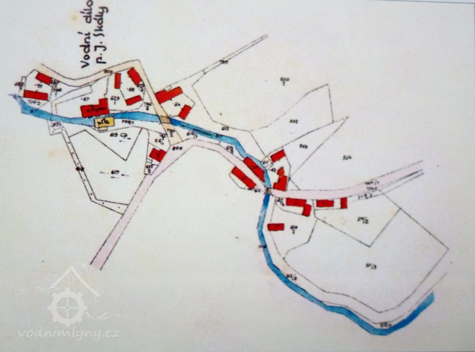 Dle zápisu úřední komise 18. září 1878: Nad mlýnem existoval 2 stavidla, každé o dvou oknech. Jedno vpouštělo vodu do vantrok a druhé do jalové strouhy. Na vantrokách existovalo 5 stavidel hlavních a 2 vedlejší. 4 hlavní stavidla vpouštěla vodu k jednotlivým kolům mlecích složení (3) a ke špičáku, páté hlavní stavidlo bylo jalové. Jedno vedlejší stavidlo pouštělo vodu k pile, druhé bylo opět jalové. Normový bod se nacházel na louce mezi potokem a jalovou strouhou. Tvořil jej kamenný hranol 70 cm dlouhý postavený v jámě na kovovou desku. Na vrcholu hranolu byla kovová deska s hřebem, opatřená letopočtem 1878 a písmeny E. S., značícími mlynáře Emanuela Skálu. (MH)