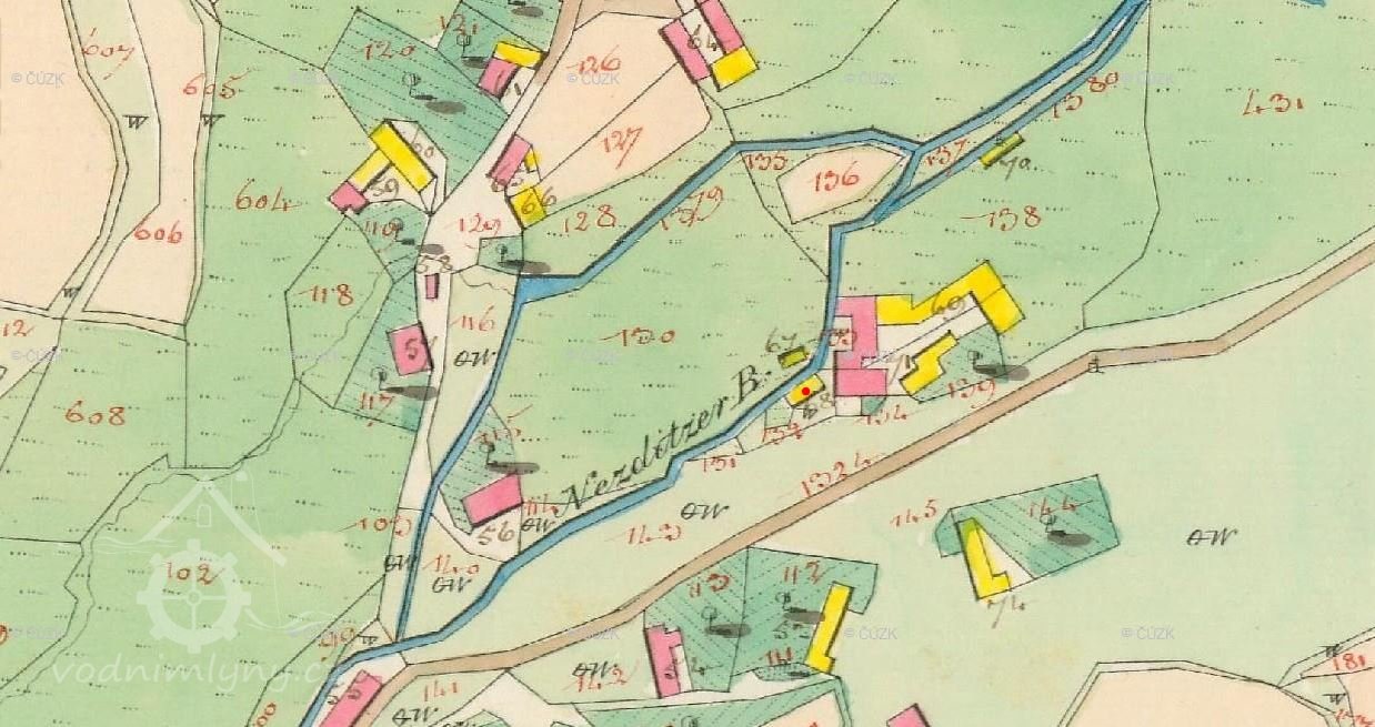 Roku 1756 kardinál Jan Filip z Lamberku propouští z poddanství Magdalenu Kotisovou za účelem sňatku s rychtářem a mlynářem ve vsi Nezdice, Jiřím Vrhelem. Je tedy velice pravděpodobné, že tento mlýn (nebo jeho předchůdce) stál již v polovině 18. století a to zřejmě na pozemku rodiny Vrhelů.