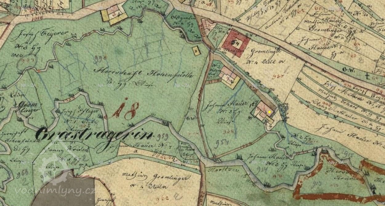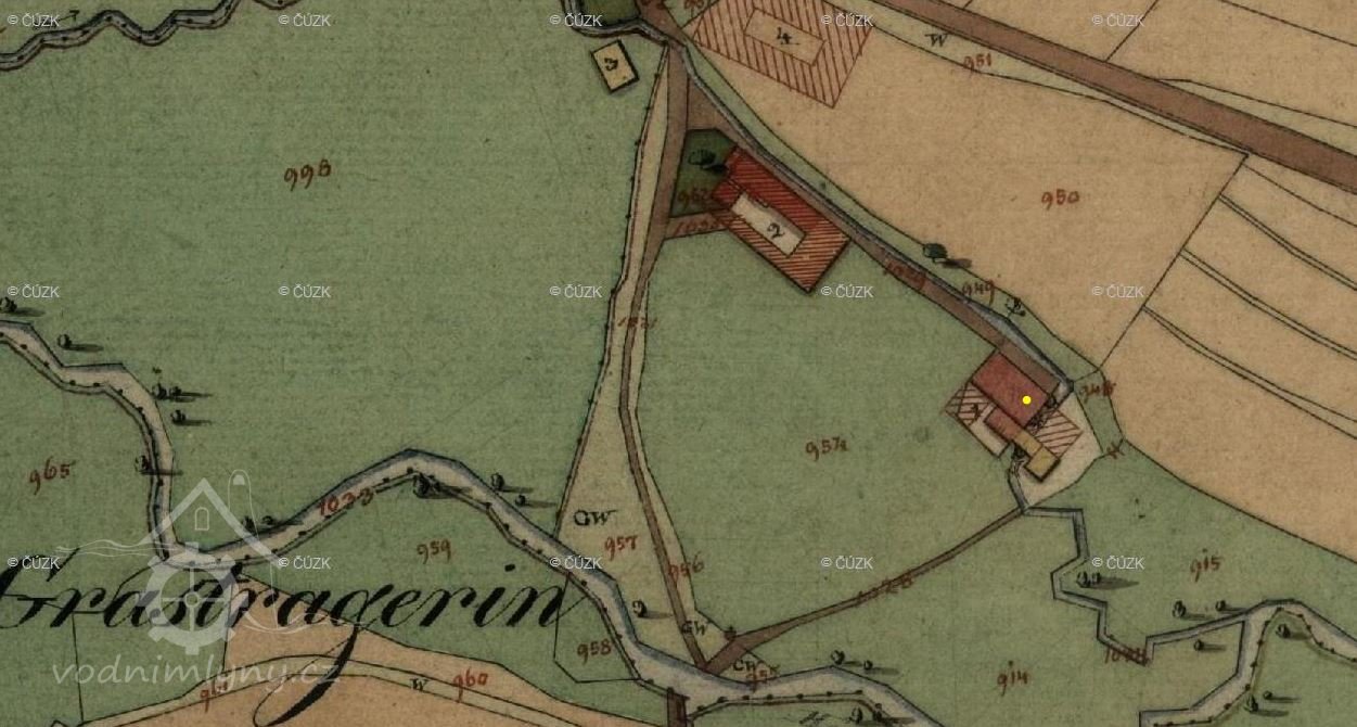 Mlýn je zachycen již na mapě I. voj. mapování. V roce 1826 mlýn provozuje Josef Pfleger.