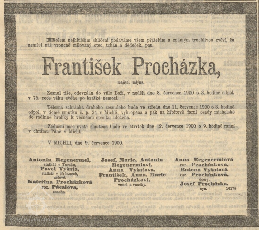 8. července 1900 zemřel ve věku 75 majitel mlýna Franišek Procházka. (RR)