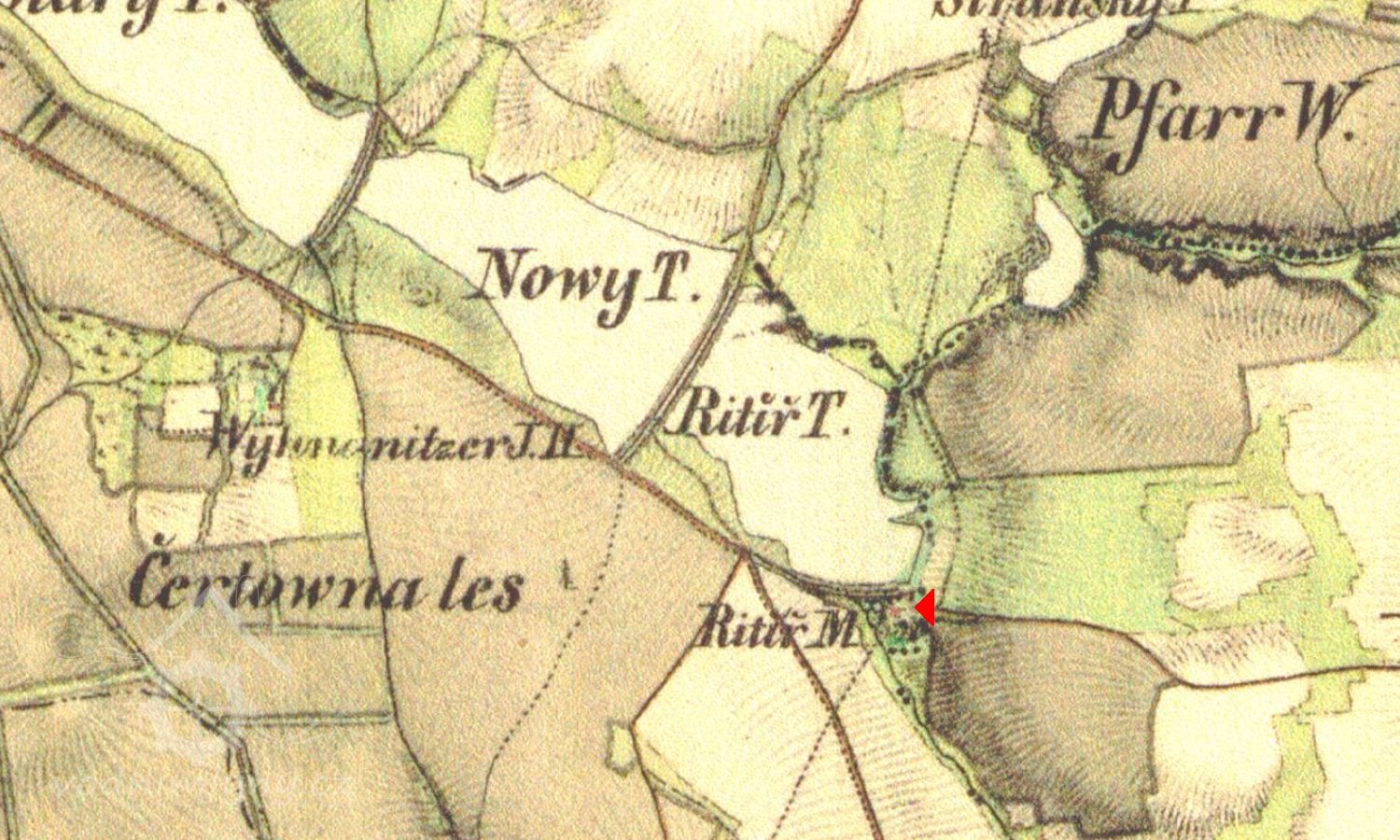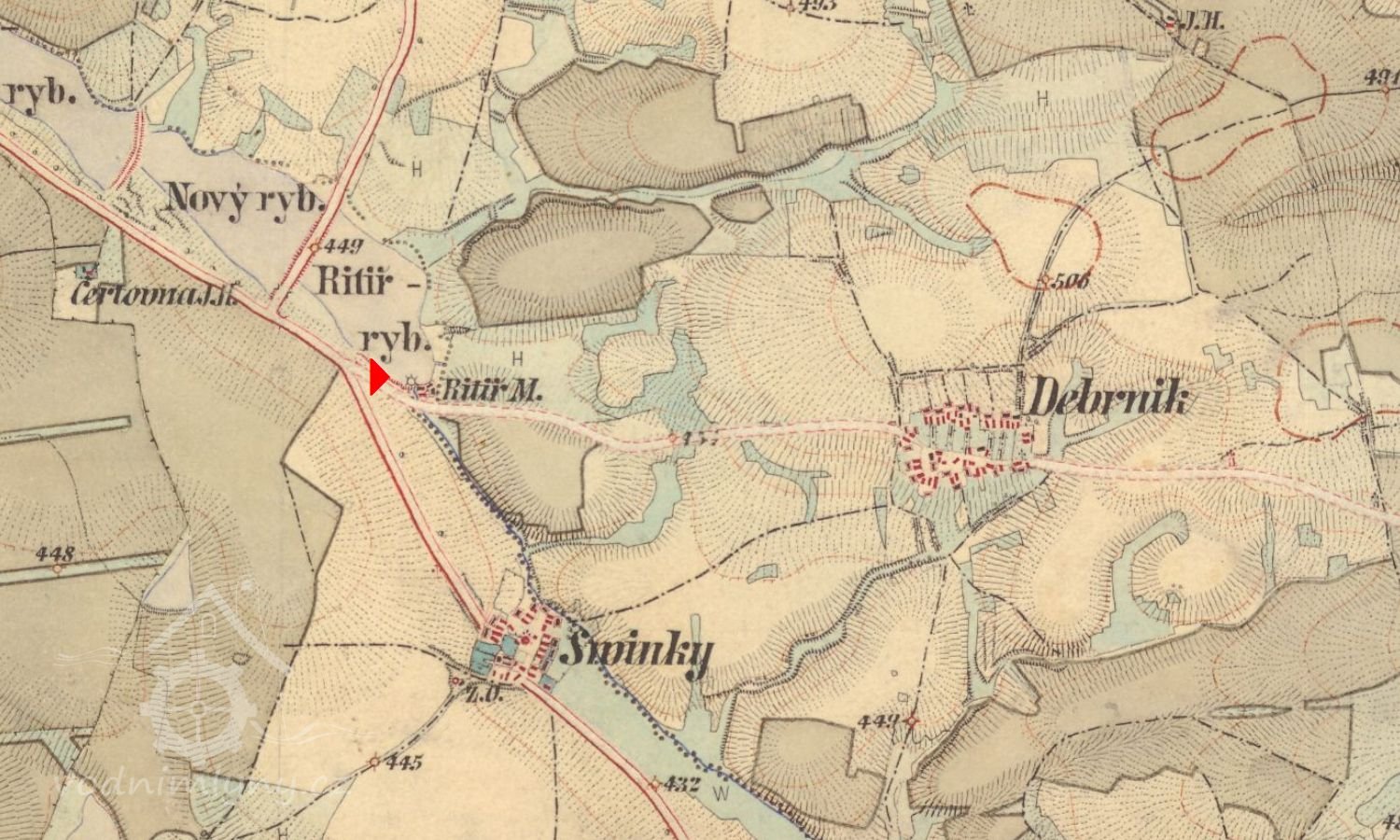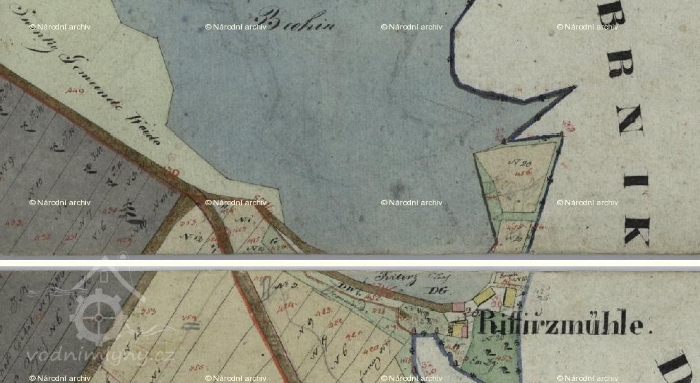 Nad mlýnem soustava 12 rybníků nebesáků - Rytíř (9 ha), Nový (11 ha), Starý (19 ha) a 9 malých (1-10 ha), mlýn však trpěl nedostatkem vody
