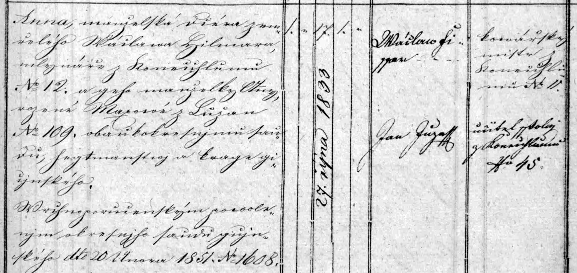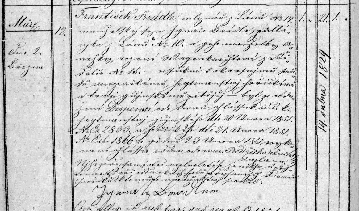 František Brádle, nar. 14. 4. 1829, se 2. března 1851 oženil s Annou. Ženichovi bylo 21 let, nevěstě 17. Anna byla dcera mlynáře Václava Hilmara z Konecchlumí č. 12  (RR).