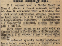 Mlýn moučný a pilný patří Františku Tichému a u něhož dosud je stará dřevěná pila v níž sám mlynář při dostatku vody rozřezává klády na desky roku 1926 vyhořel a v roku 1927 byl znovu postaven. Dřevěná pila nevyhořela. Ještě za předešlého majitele mlýna Bedřicha Janáčka patřilo právo řezati klády na pile panství novoměstskému, až jmenovaný mlynář Bedřich Janáček právo toto i pilu od panství koupil.