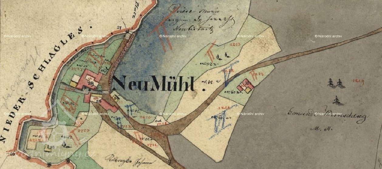 Nový mlýn se nacházel u Vojířovského, později Novomlýnského rybníka na Koštěnickém potoku. Mlýn s pilou zanikl počátkem šedesátých let 20. století zřízením hraničního pásma.