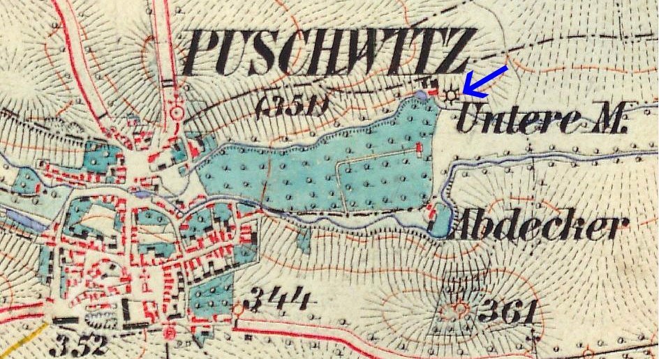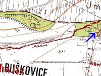 Mlýn se nacházel mezi Buškovicemi a gotickou tvrzí v Hlubanech.