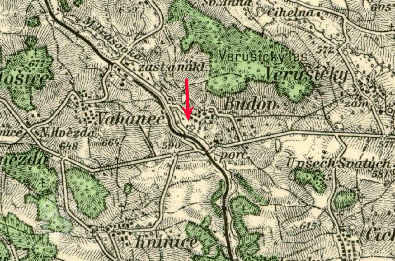 Zaniklý mlýn ve vsi Budov (část obce Verušičky) na Karlovarsku. Mlýn stál ještě v 50. letech minulého století, nyní jsou z něj již jen rozvaliny.