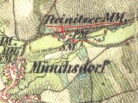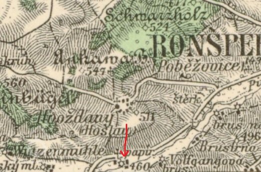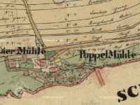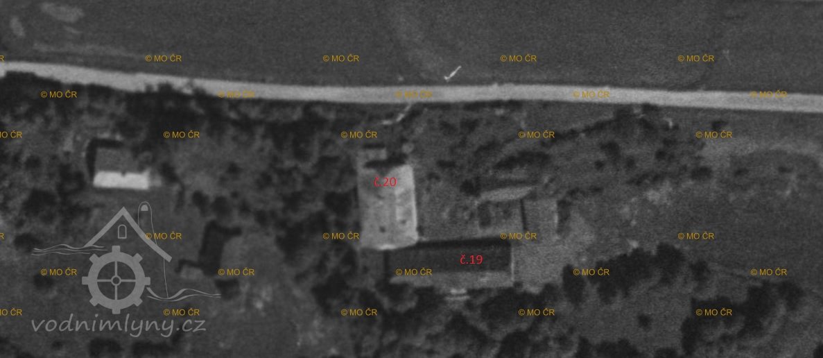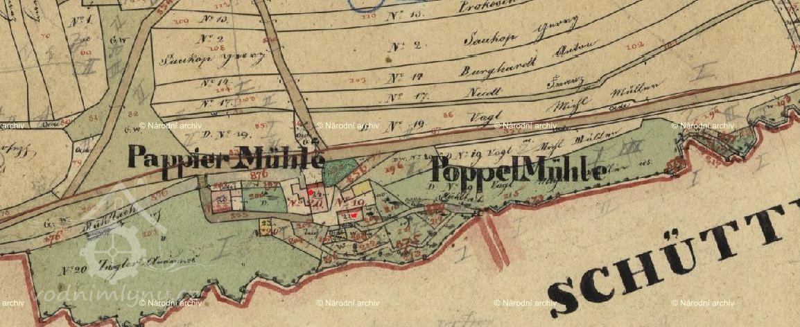 1838 – skica nespalná obdélníková budova na náhonu, dvě kola, naproti malá dřevěná, majitelelm Michal Vogl, na otisku jedno kolo. Na originální mapě zaznamenány stavební změny, zvětšení budovy.