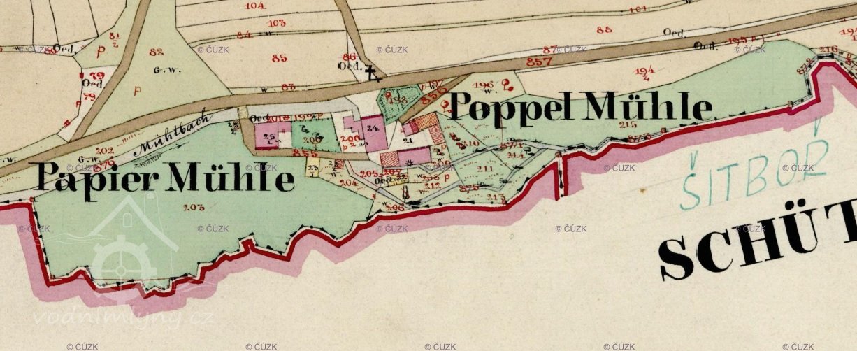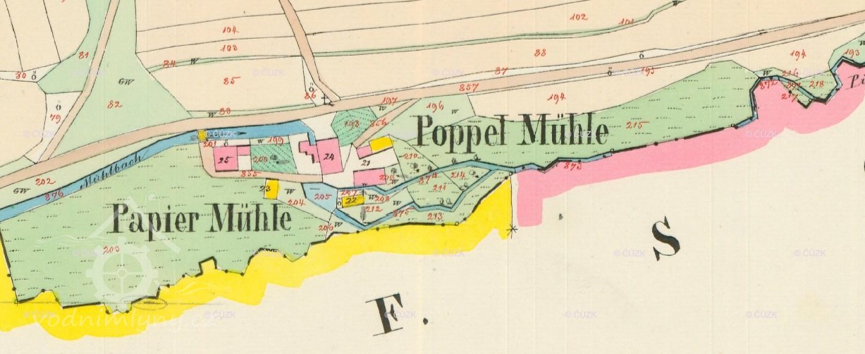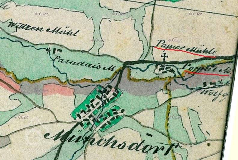 V dnešních mapách jako Papírna. Mlýn zaznamenaný ještě na mapách z 1.republiky zanikl pod skládkou odpadu bez viditelných stop.