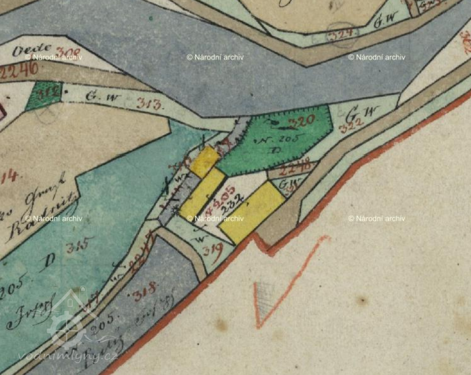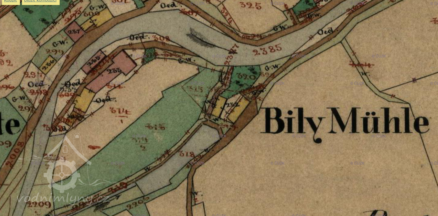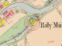 Mlýn pojmenovaný podle majitele, nikoliv podle barvy. Dochována pouze obytná budova, s ní rovnoběžná mlýnice zbořena.