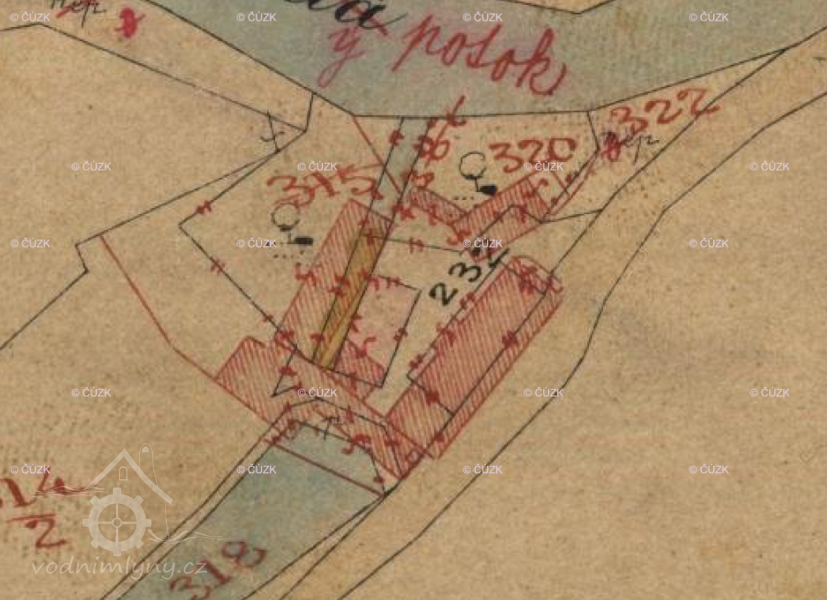 Popis1930: 1 kolo na svrchní vodu, hltnost 0,083 m3/s. spád 4,1 m, výkon 4 HP