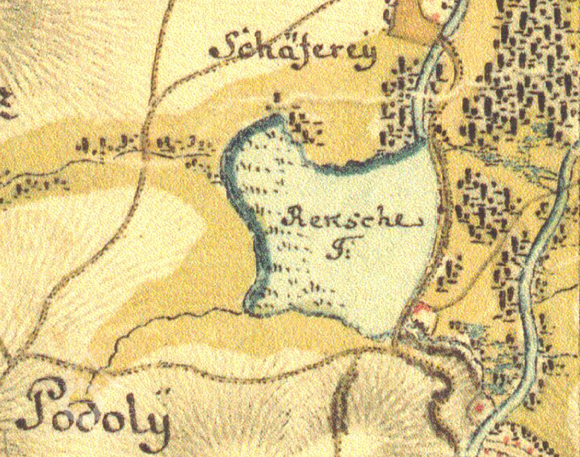 I. vojenské mapování, výřez, patrný velký rybník nad mlýnem, 1764 - 68, © oldmaps.geolab.cz