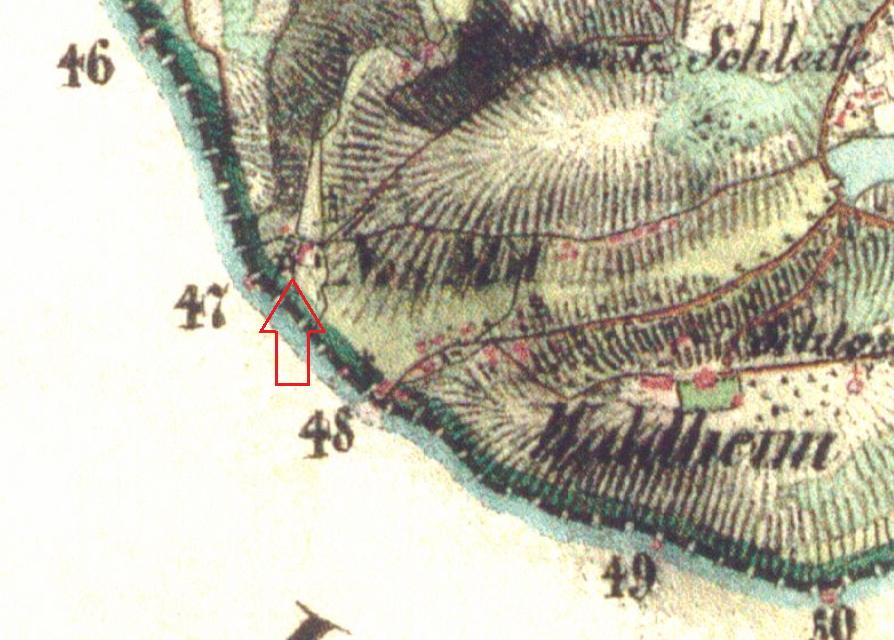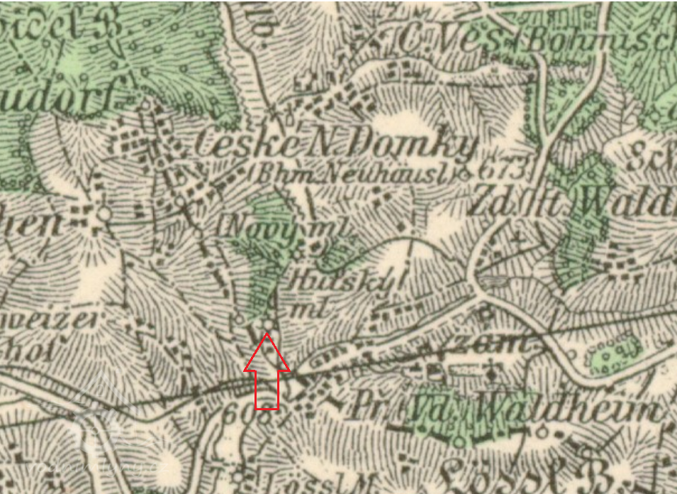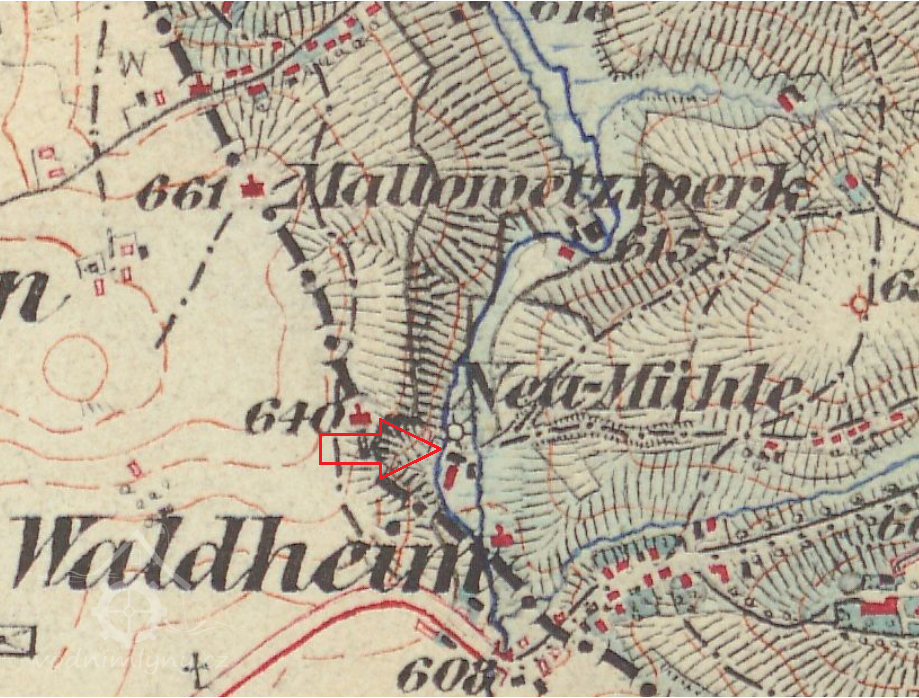 Nepatrné stopy budov těsně při hranici patří Waldheimskému Mlýnu, který byl nazýván také Novým nebo Huťským Mlýnem. Polohu mlýna dnes připomíná litinový kříž, vyzdvižený Johannem Steinerem r. 1841. Mlýnský rybník a rozpadlá propust, kterou dnes uzavřely svou hrází bobři (hráz je čerstvě vybagrována), jediní obyvatelé této opuštěné enklávy, jsou posledními připomínkami zaniklého osídlení.