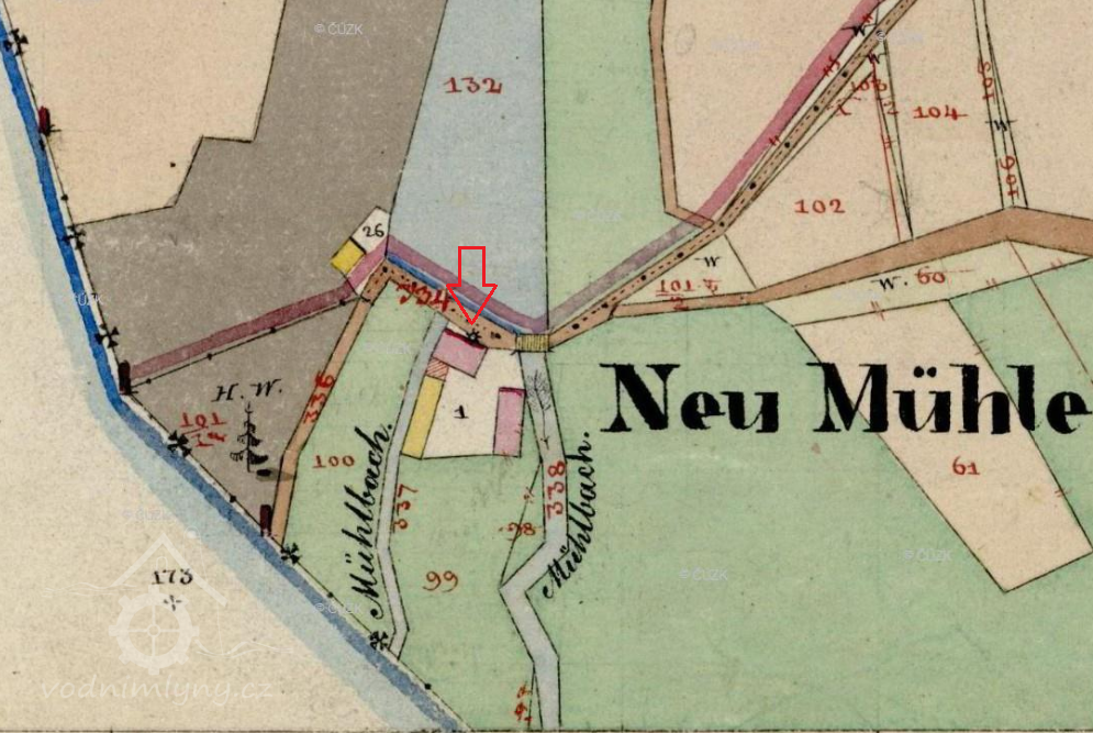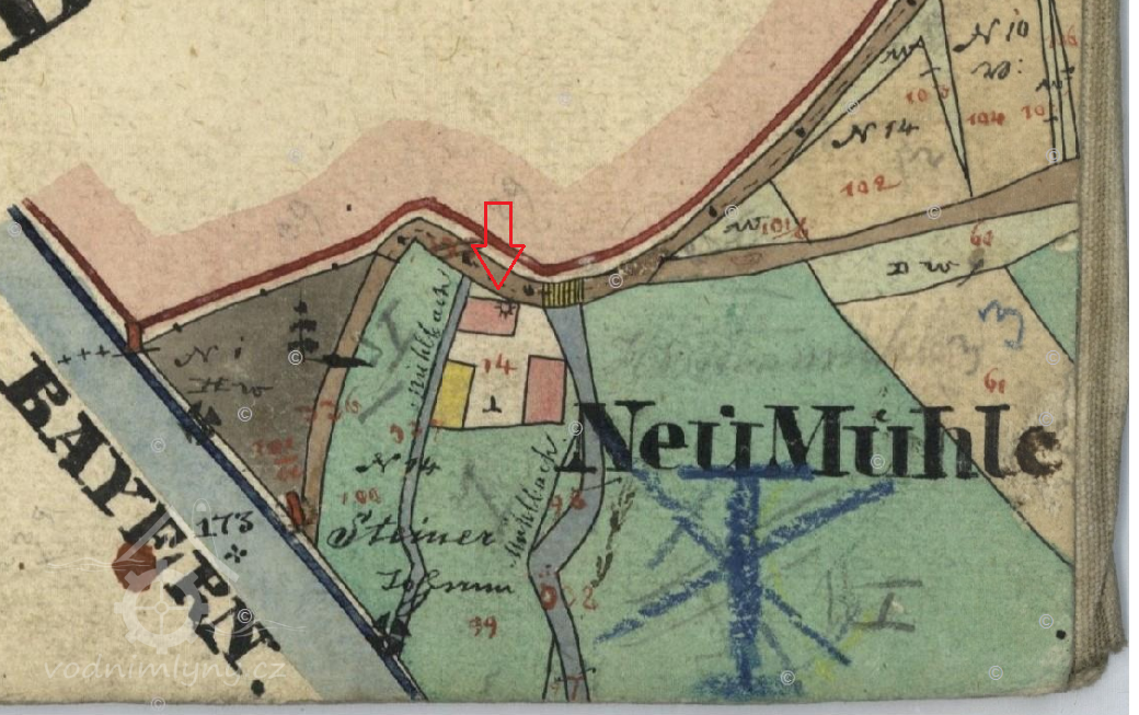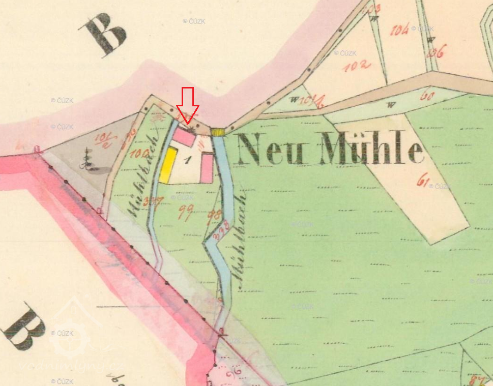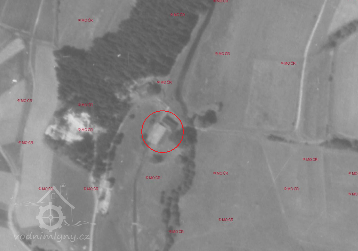 I. vojenské mapování z let 1764–1768 zobrazuj mlýn s rybníkem. Po hrázi rybníka probíhala katastrální hranice mezi Českou Vsí a Zahájím. Rybník ležel na úžení České Vsi, mlýn na území Zahájí. Tato situace je potvrzena na mapách stabilního katastru z roku 1838.