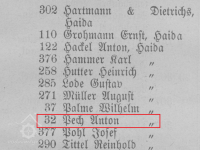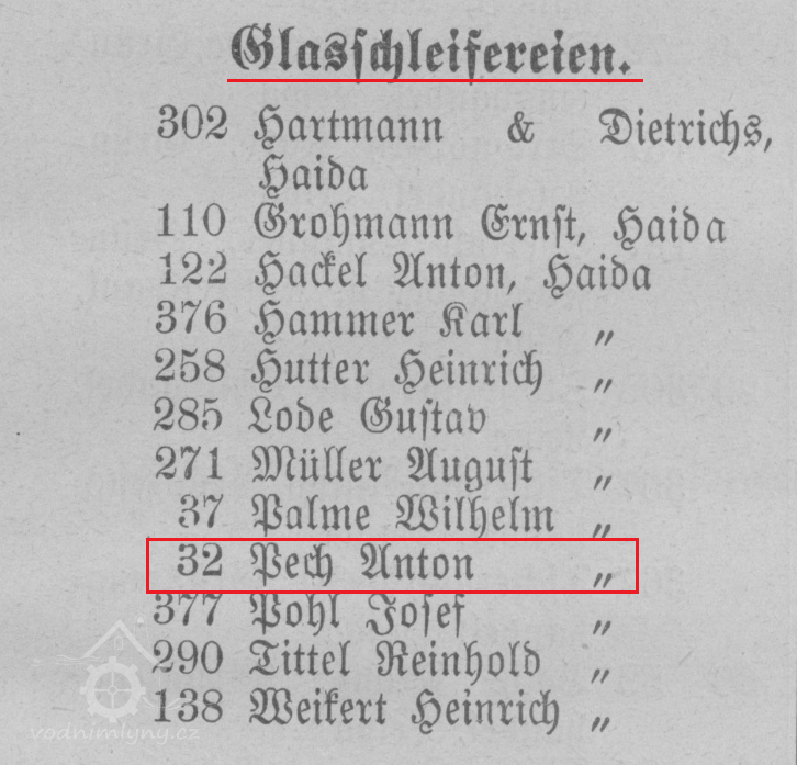Adresář města Nový Bor evidoval v roce 1907 v čp. 32 brusírnu skla, majitelem byl tehdy Anton Pech.