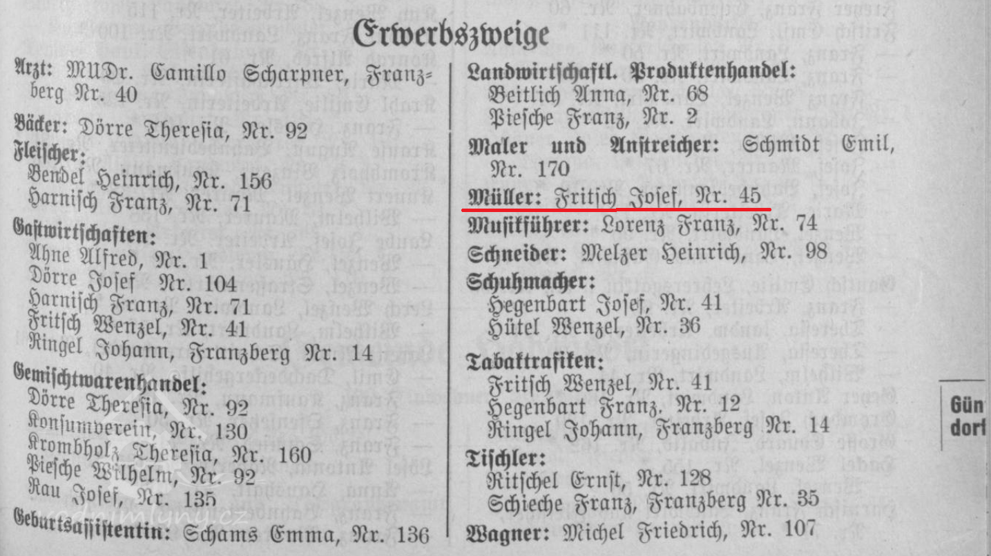 V roce 1927 uvádí adresář obce v čp. 45 mlynáře Josefa Fritsche, stejný údaj je ve výpisu živností Huntířova z roku 1934.