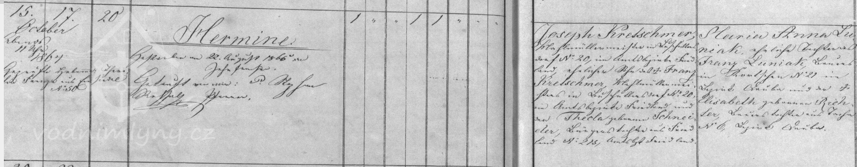 Franz Kretschmer zemřel v roce 1855 na cirhózu jater, dalším mlynářem se stal jeho Josef Kretschmer, narozený v březnu 1834. Josefovou manželkou byla Maria Anna Luniak, dcera zemědělce z obce Korce u Dubé. Do roku 1880 se jim zde narodilo 6 dětí, Hermine (1865, †), Wilhelm Hermann (1866), Emilius (1869), Bertha Maria (1875), Franz (1877, †) a Maria Anselma (1880). Na mlýně bydlel také Josefův mladší bratr Albert – Adalbert s manželkou Marií Pfohl.