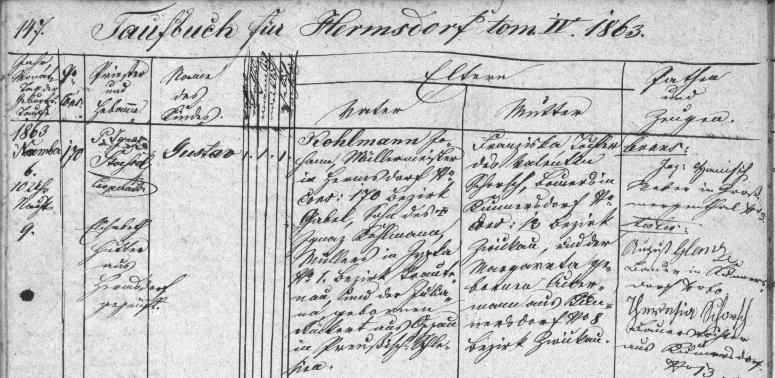 V 50. a 60. letech 19. století zde hospodařil mlynář Johann Kohlmann, který pocházel z mlynářského rodu Kolhmannů na okrese Trutnov. Za manželku měl Franziskou Schorch, dceru sedláka z Kunratic u Cvikova. Do roku 1865 narozeny děti Johann Franz (1856), Karl (1858), Wilhelmine (1859), Gustav (1863) a Maria (1865).