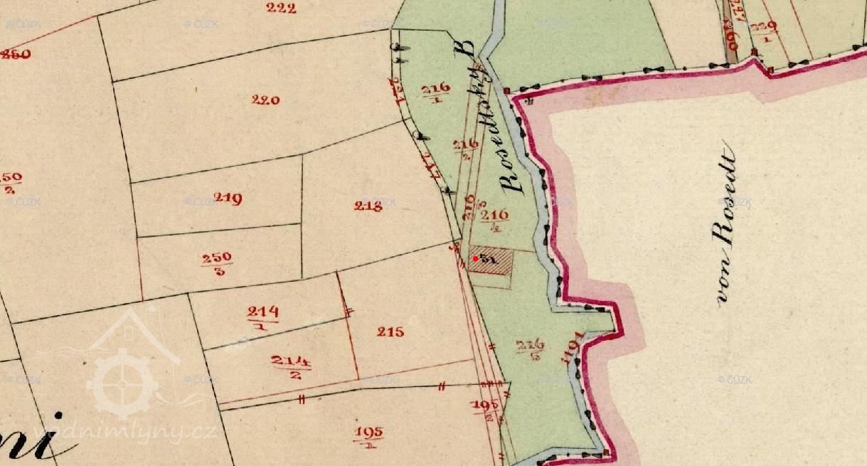 Mlýn vznikl až po roce 1837, na Císařském otisku zakreslen není a na indikační skice a originální mapě stabilního katastru je zanesen jako dokreslená stavba.