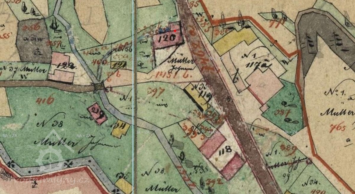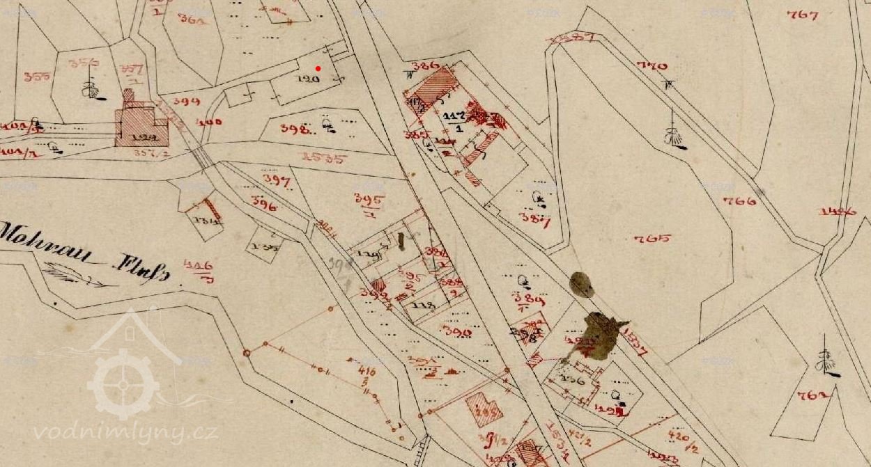 PopisV roce 1930 pohání papírenské zařízení ve mlýně kolo na svrchní vodu s průtokem 0.1 m3/s, spádem 5 m o výkonu 4 HP.