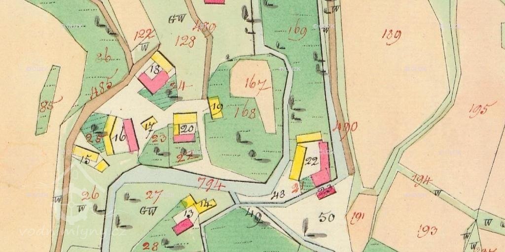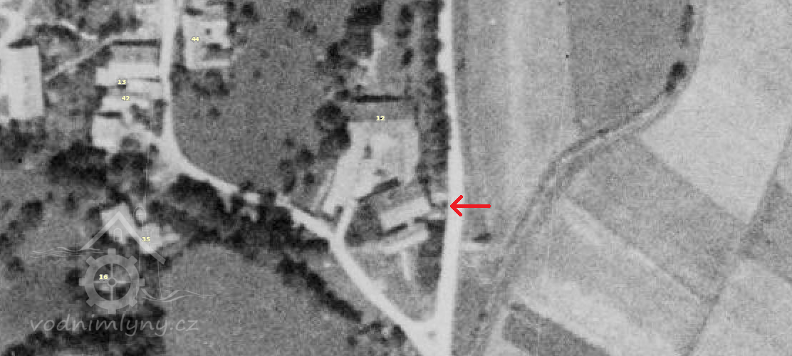 Vodu přiváděl ke mlýnu náhon vedený podél silnice, odtokový kanál sloužil jako náhon k sousednímu mlýnu čp. 17.