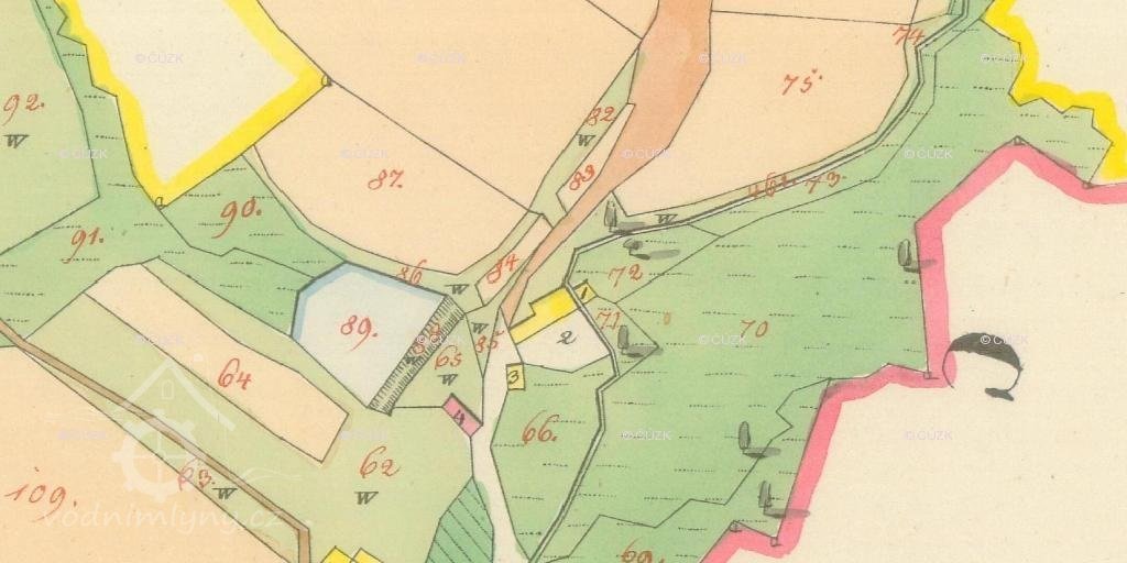 PopisV roce 1930 pohání mlýn a pilu dvě kola na svrchní vodu s průtokem 0.094 m3/s, spádem 4 m o výkonu 3.25 HP každé.