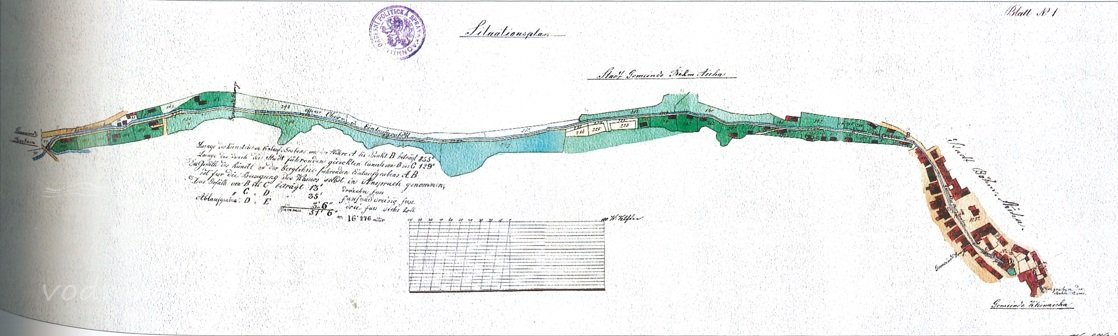27.6.1929 osazen pevný bod od parvého břehu náhonu 2,9 m a 2,8 m od spadiště pevného jezu.