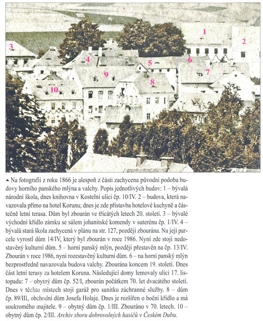 V městě proti zámku jest mlýn o dvou kolách, moučnici a jedné stoupě, dobře od kamene vystavený se všemi potřebani opatřený. Pod týmž mlýnem jest místnost k napájení hovad všelikých. Mlýn tento mlynář pronajímá a platí z něho každého roku k panské potřebě výmelného míry turnovské 36n korců, po 30 groších počítajíc, činí 18 kop grošů do roka. V tom mlejně měšťané sobě k potřebě slady melou a od každého varu sladu semletého platí vrchnosti 3 groše. Při tom mlejně jest taky pila dobře udělaná, se všemi k tomu náležutými potřebami, na kteréž pile se prkna panská a jiným lidem řezají a z té pily jest mimo domácí potřebu užitku 10 kop