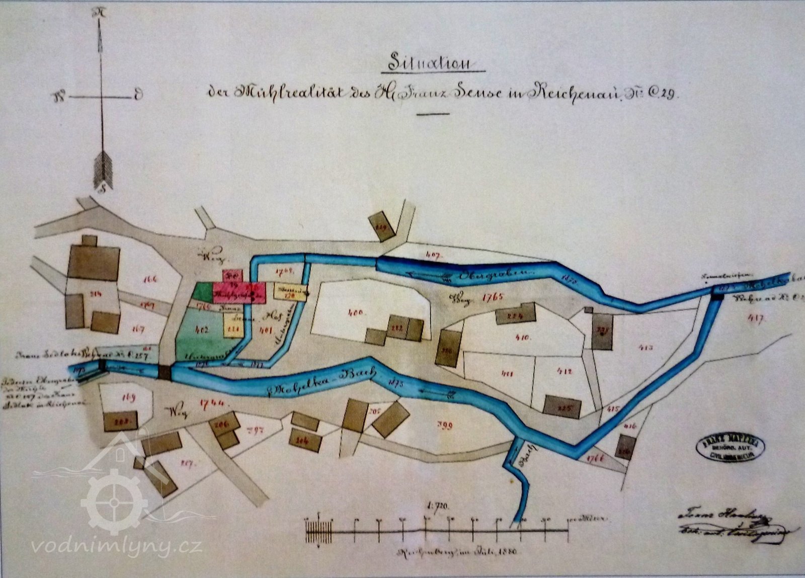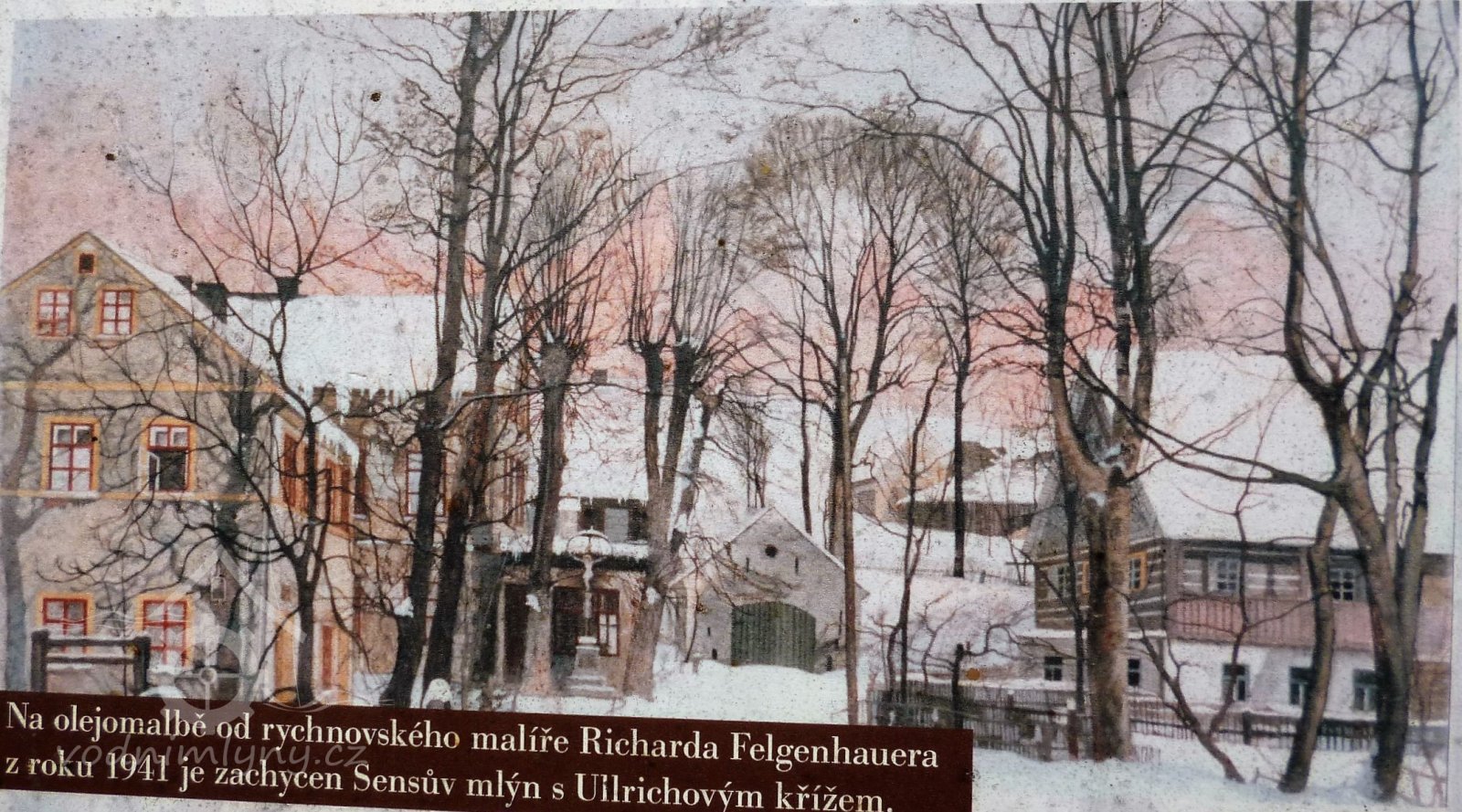 Po celé období vlastní mlýn mlynářský rod Sense. Od roku 1867 pečovala rodina mlynáře Sensa o tzv. Ullrichův kříž, který dal v roce 1804 zřídit majitel nedalekého hostince U Koruny v Mlýnské ulici čp. 30 Franz Ullrich. V roce 1867 Franz Ullrich hostinec prodal a odstěhoval se do stráže nad Nisou. Tak se kříž dostal pod ochranu a péči  Sensovy rodiny. Lze předpokládat, že i Ullrichův hostinec v Mlýnské ulici čp. 30 se dostal do rukou příbuzných mlynářského rodu Sense. V Třetí pamětní knize rychnovské fary a rovněž v Preisslerově kronice 2. díl  je zápis z roku 1901 v souvislosti s volbami, kdy je Josef Sense, hostinský z čp. 30, zvolen za druhý volební okrsek do rychnovského zastupitelstva. A později v roce 1915 je uváděn zápis o Anně Sense z čp. 30 v souvislosti s darem pro farnost, dála pak v roce 1923 opět v souvislosti s darem je jmenována Maria Sense, manželka hostinského z čp. 30.