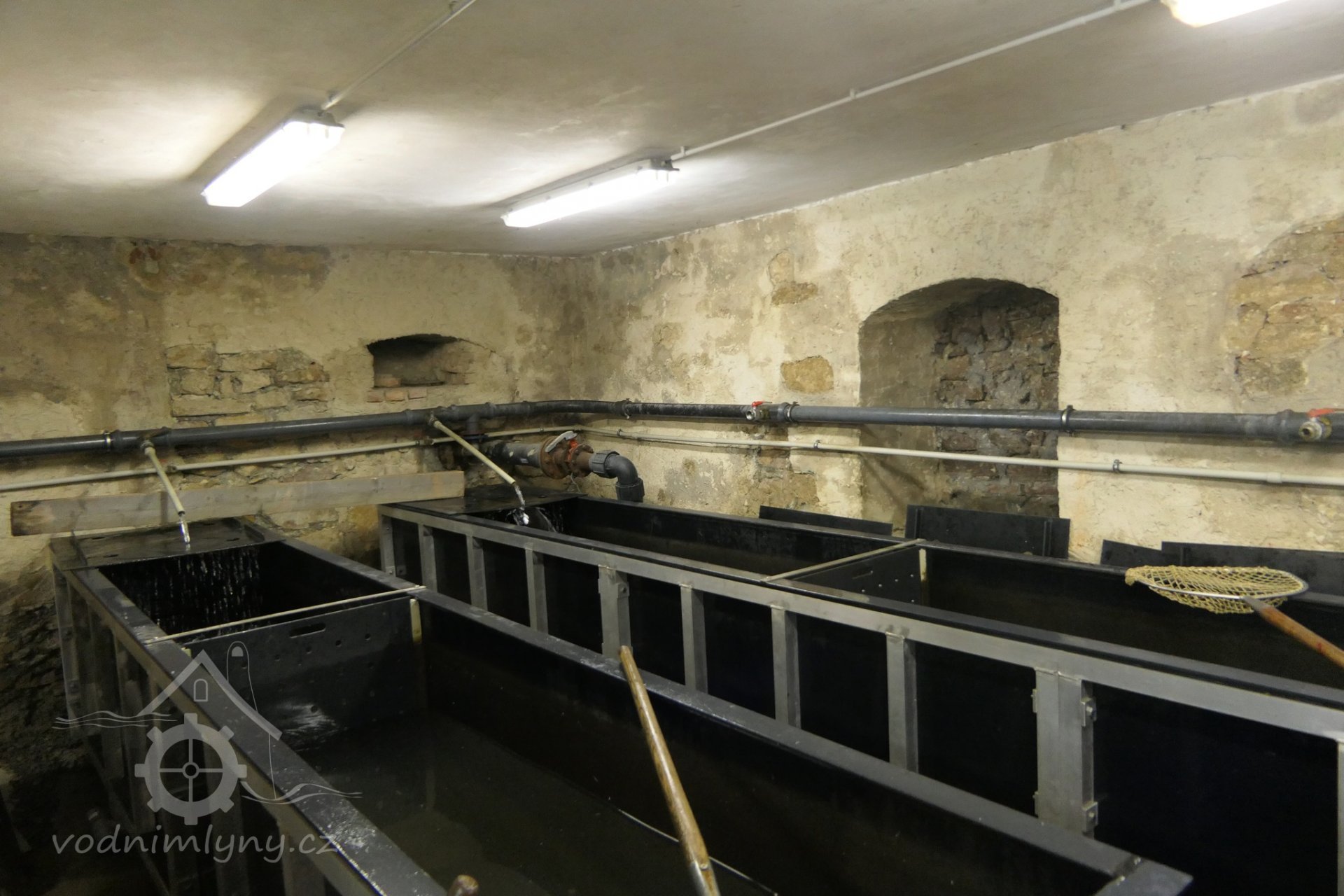 V témž mlejně složení dvoje s kolmi vodními palečními a stúpam , kteréž mlejnské kolo jedno táhne, a jinými všemi přináležejícími případnostmi. Item veřeje dřevěny od strany západní od hráze rybníka, při nichž dveře na pantích, kterýmiž se přichází na podlahu strojů mlejnských. Opět jiny veřeje kameny se dveřmi bez pantů do lednice zděny. V tom mlejně při zemi oken štukových na poledne 2, na půl noci 3, činí 5, a v nich mříže železny čtyry.