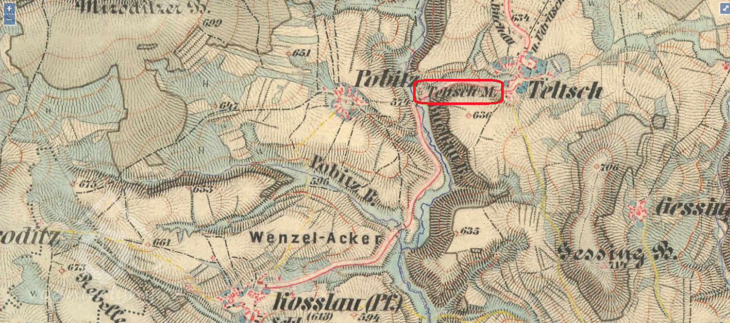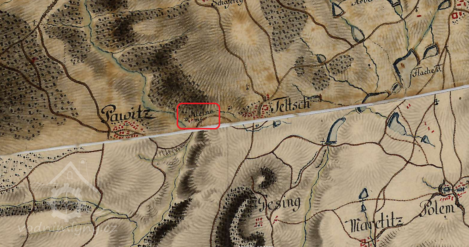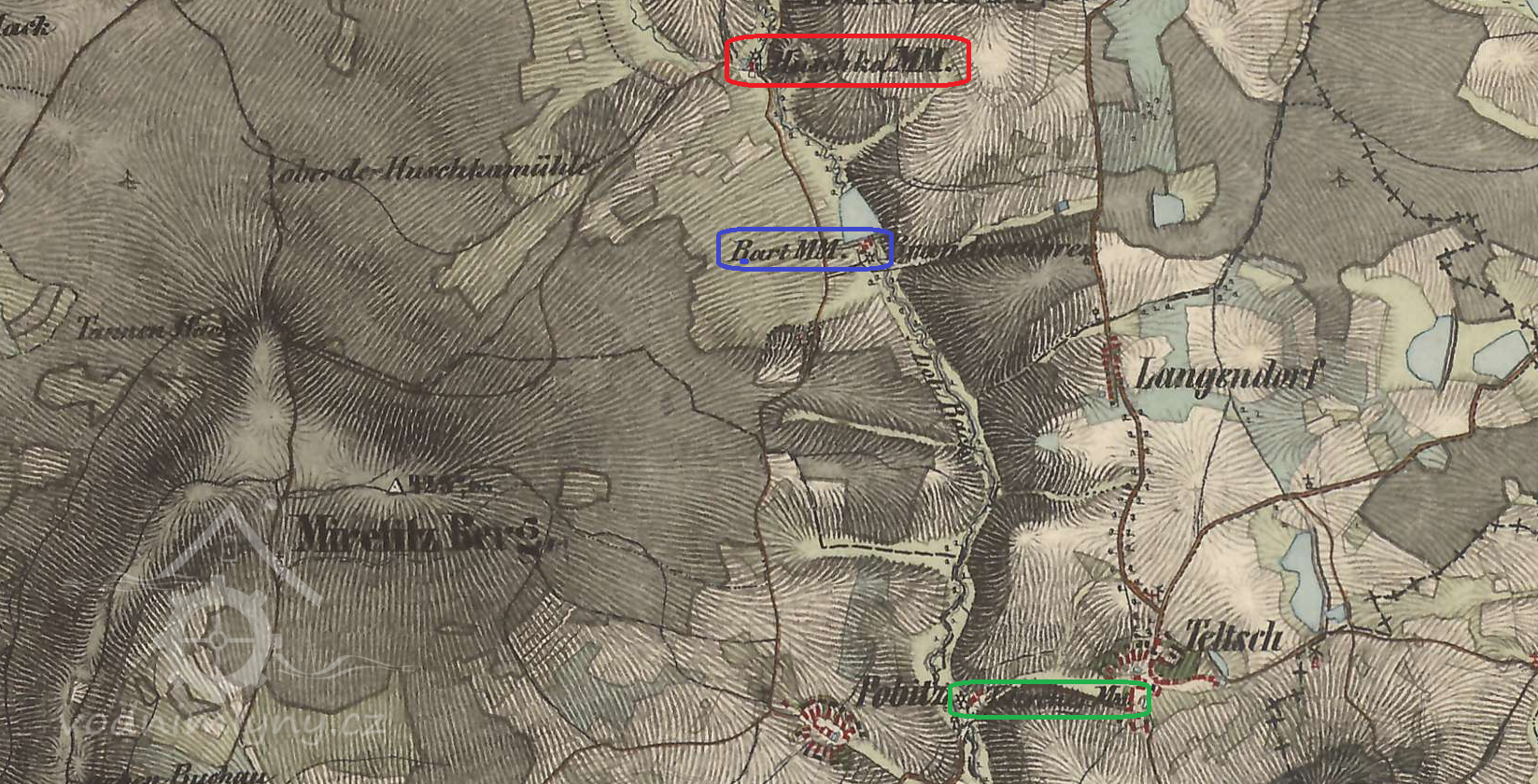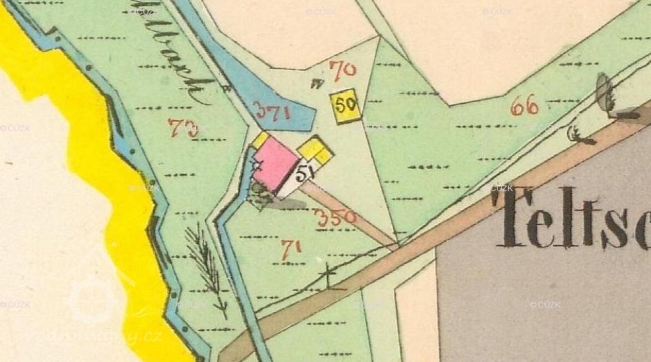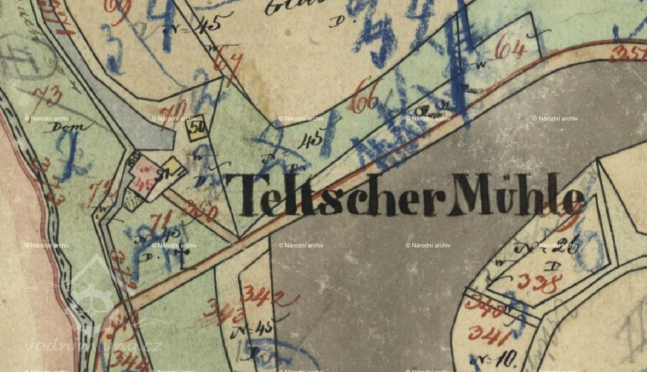 Vodní mlýn, nazývaný Telečský mlýn (Teltscher Mühle), byl vystavěn v neznámé době v údolí na levém břehu Bochovského potoka (Buchauer Bach, Loh Bach) při cestě do Kozlova asi 450 metrů západně od vsi Teleč (Teltsch). Mlýn je prvně zachycen pod názvem Malý mlýn (Kleine Mühle) na mapě 1. vojenského josefského mapování z let 1764-1768. Na mapě stabilního katastru vsi z roku 1841 je jako držitel Telečského mlýna čp. 45 uveden Josef Glaser. Posledním předválečným majitelem mlýna byl pak Julius Glaser.